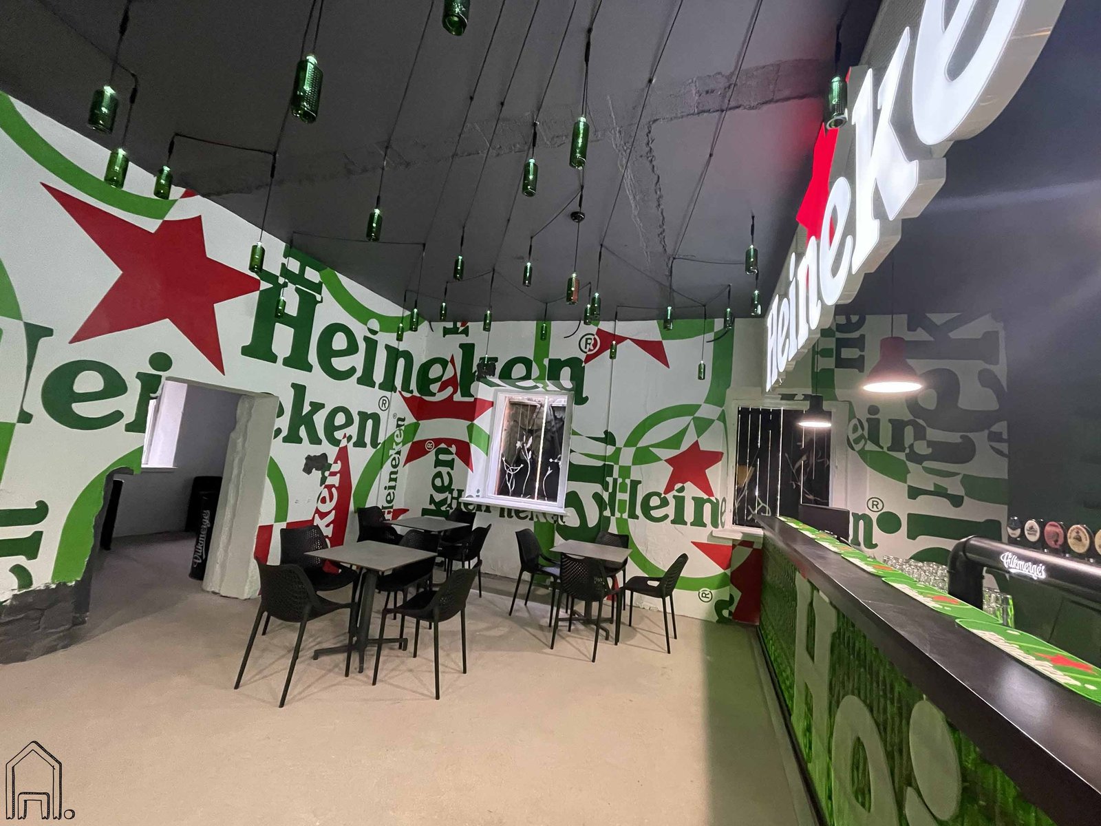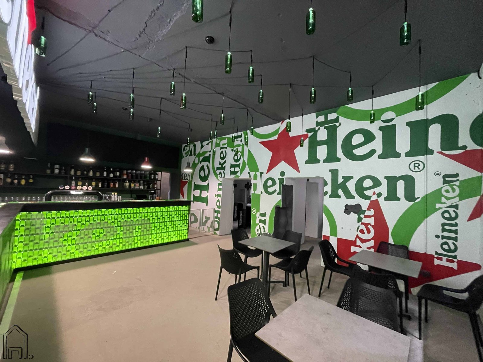 Išskirtinio, urbanistinio stiliaus baro interjere piešiniais dekoruotos kelios sienos.Stilingas interjeras sukurtas naudojant penkių spalvų paletę ir "Heineken" alaus logotipo dizaino variacijas.