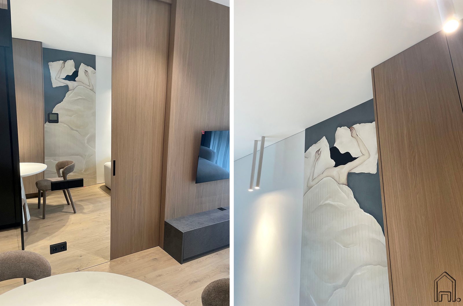 Romantiškas, neutralių pastelinių tonų piešinys, nutapytas svetainėsir valgomojo zonų sandūroje. Šiuolaikiškame interjere įgyvendintas dizainerės idėja - puriuose pataluose paskedęs merginos siluetas.