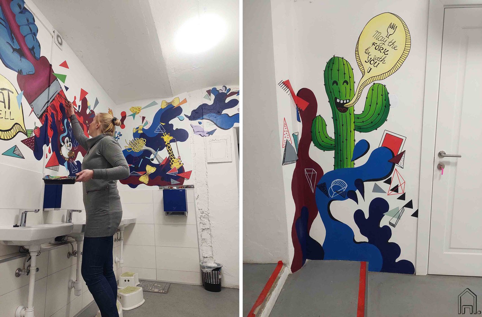 Pirmasis piešinys atsirado mokinių valgyklos prieangyje, virš praustuvų skirtų nusiplauti rankas prieš puryčius ar pietus. Idėją piešiniui pasufleravo pokalbis susitikimo metu apžiūrint patalpas. Užsakovai norėjo, kad spalvingi piešiniai užlietų baltas mokyklos erdvių sienas. Taip pirmajame piešinyje atsirado dailininko ranka su teptuku. Nuyo teptuko potėpių į šonus tykštančiuose dazuose atsiranda įvairios formos, figūros, linksmi personažai.