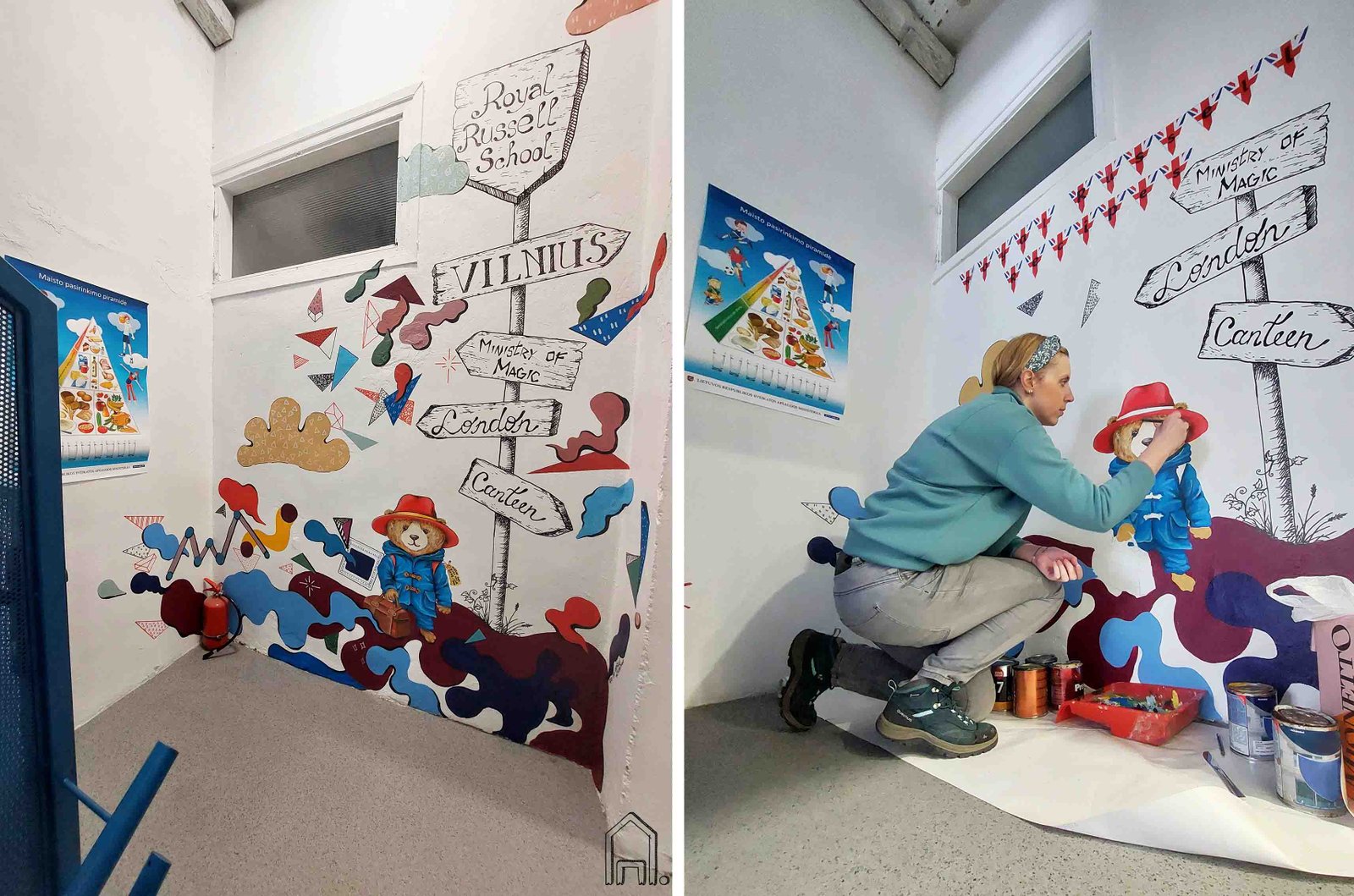 Kylant laiptais aukštyn iš valgyklos į pirmąjį mokyklos aukštą laiptinės sienos užsipildo spalvingais bangų pliūpsniais, kur galima išvysti ir ant bangų besisupantį ančiuką, ir skrendantį raguotą pabaisiuką, ir mokyklos vaikų numilėtinį meškutį Padingtoną.