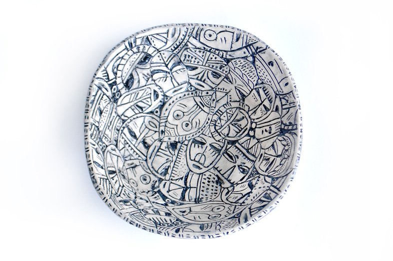 Kaskart paėmus į rankas balto molio gumulėlį sunku nuspėti, kas iš jo atsiras.. Na, o kiekvienas dubenėlis dekoruotas raižiniais, sukurtais remiantis tradicinėmis viso pasaulio genčių kaukėmis.