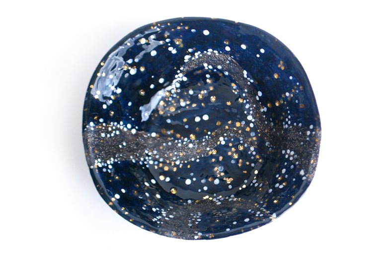Rankomis lipdytas balto molio dubuo vaisiams. Tamsiai mėlynos ir juodos gazūrų derinys, potėpiai ir pataškymai dubens viduje formuoja tapybišką nakties dangaus vaizdą.