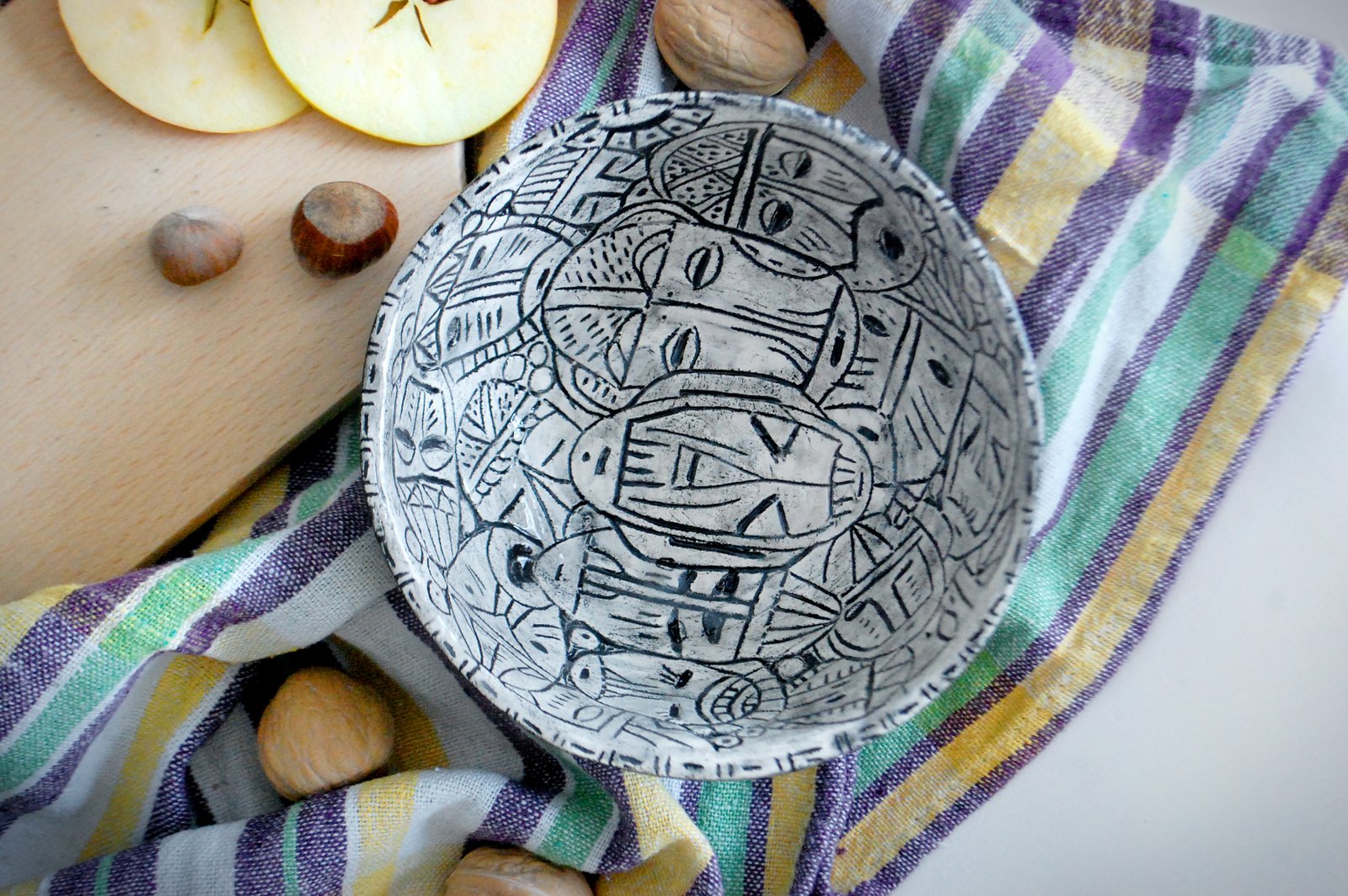 Rankomis lipdytas balto molio dubenėlis dekoruotas raižiniais, sukurtais remiantis tradiciniais Pietų Amerikos ir Afrikos genčių kaukėmis.