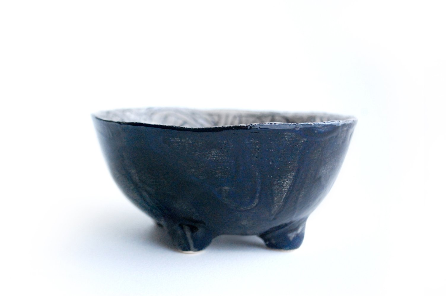 Dubenėlis stovi ant mažų storuliukių kojelių. Dubenėlio išorė aptaškyta sodria juodai mėlyna glazūra.
