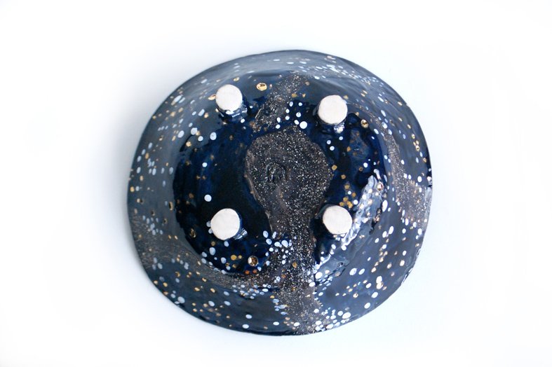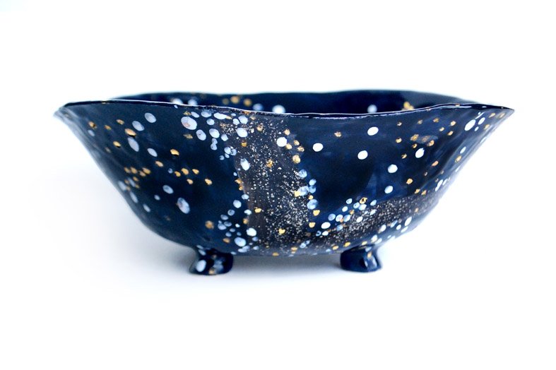 Rankomis lipdytas balto molio dubuo vaisiams. Tamsiai mėlynos ir juodos gazūrų derinys, potėpiai ir pataškymai dubens viduje formuoja tapybišką nakties dangaus vaizdą.