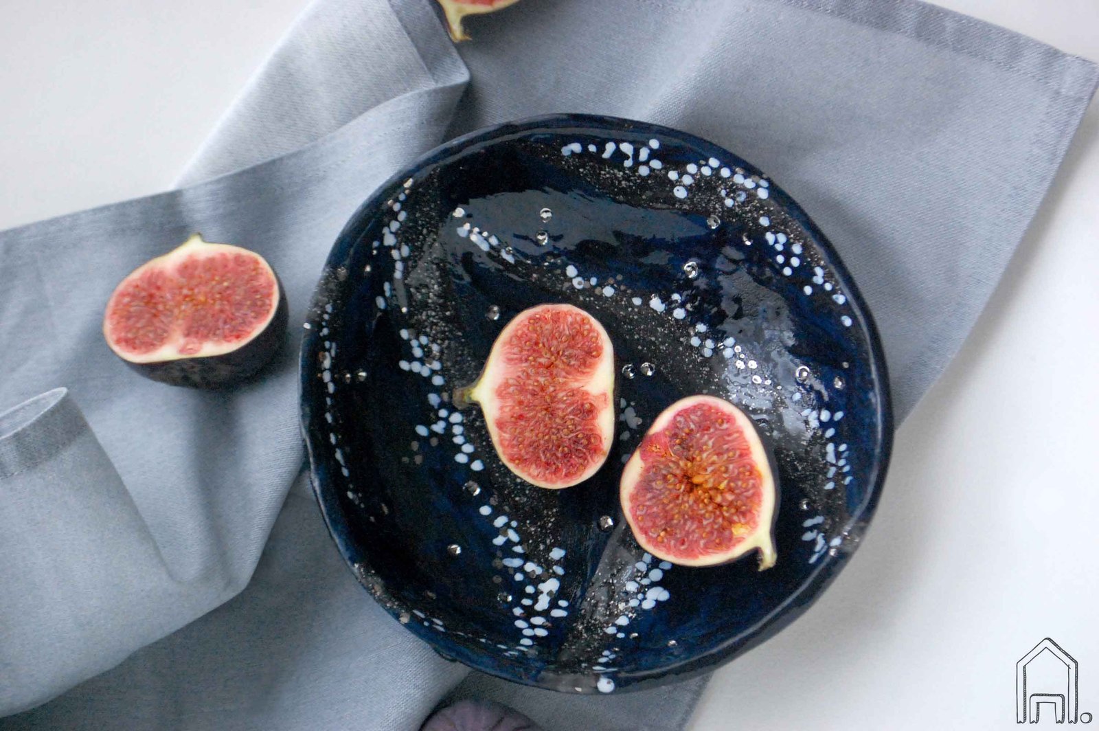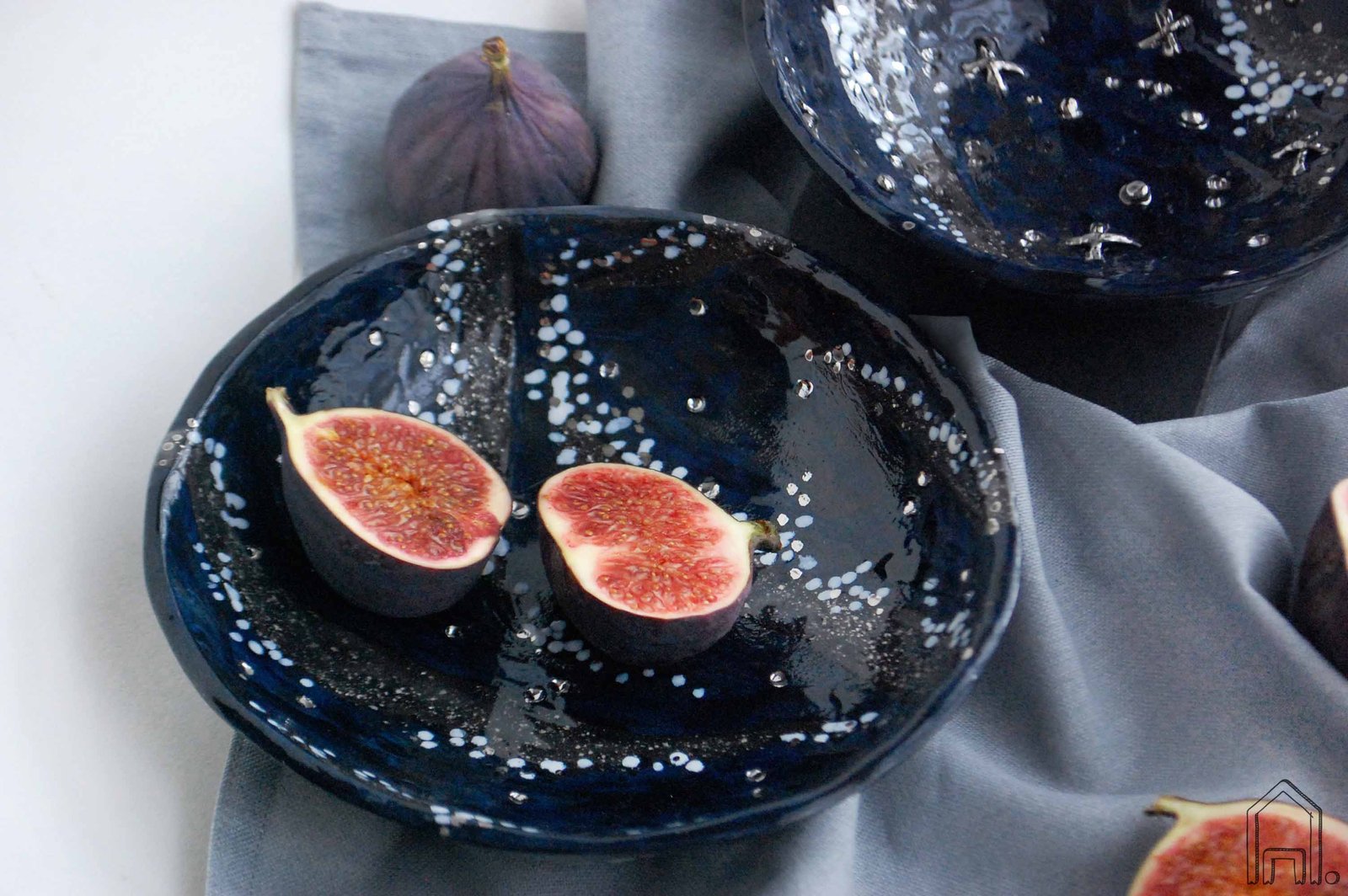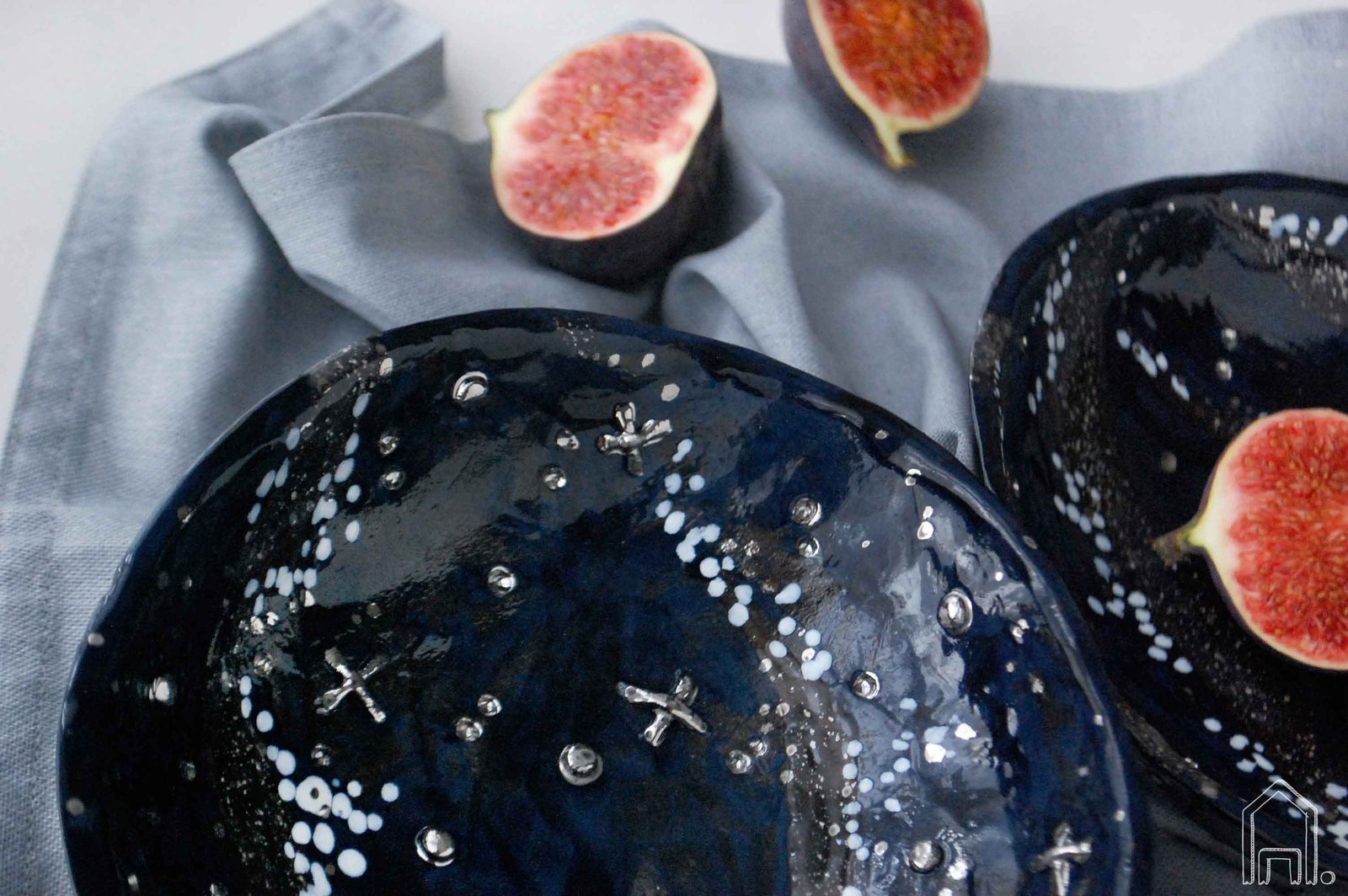 Rankomis lipdytas juodo molio dubenėlis užkandžių, uogų, riešutų serviravimui. Tamsiai mėlynos ir juodos gazūrų derinys, potėpiai ir pataškymai dubens viduje formuoja tapybišką nakties dangaus vaizdą.