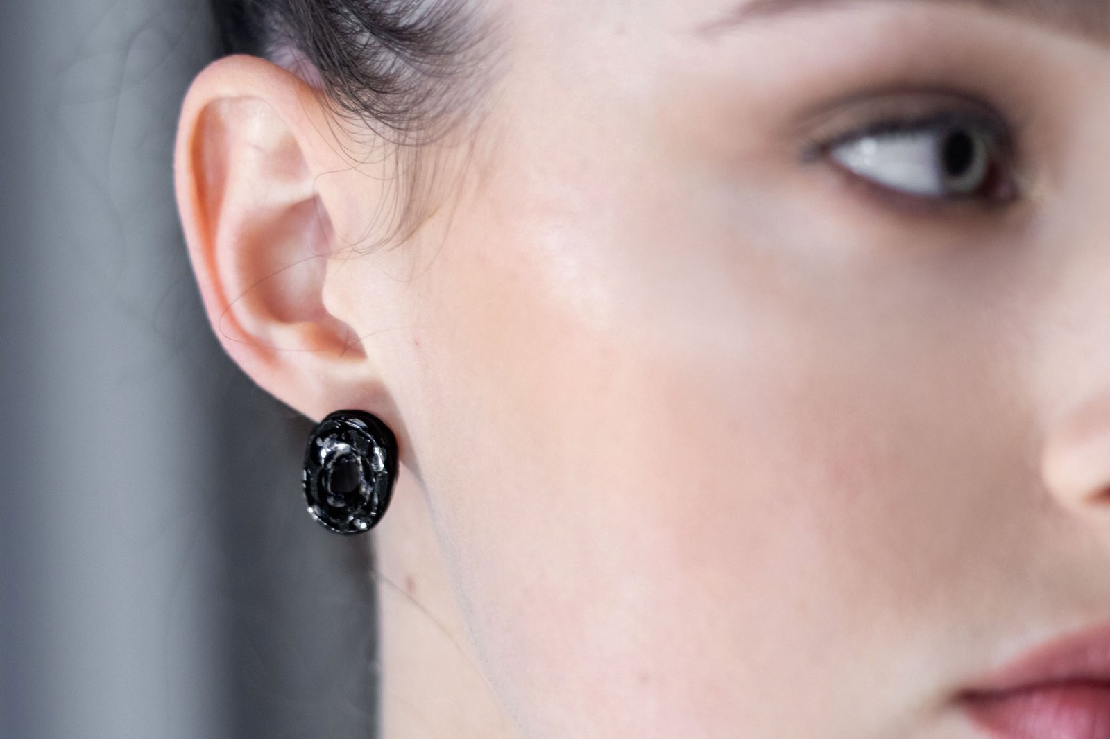 Juodi lyg naktis auskarai su išformuotu netaisyklingu krateriu - kiauryme, dekoruoti platinos lašeliais.