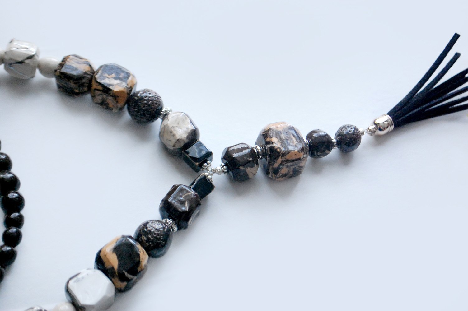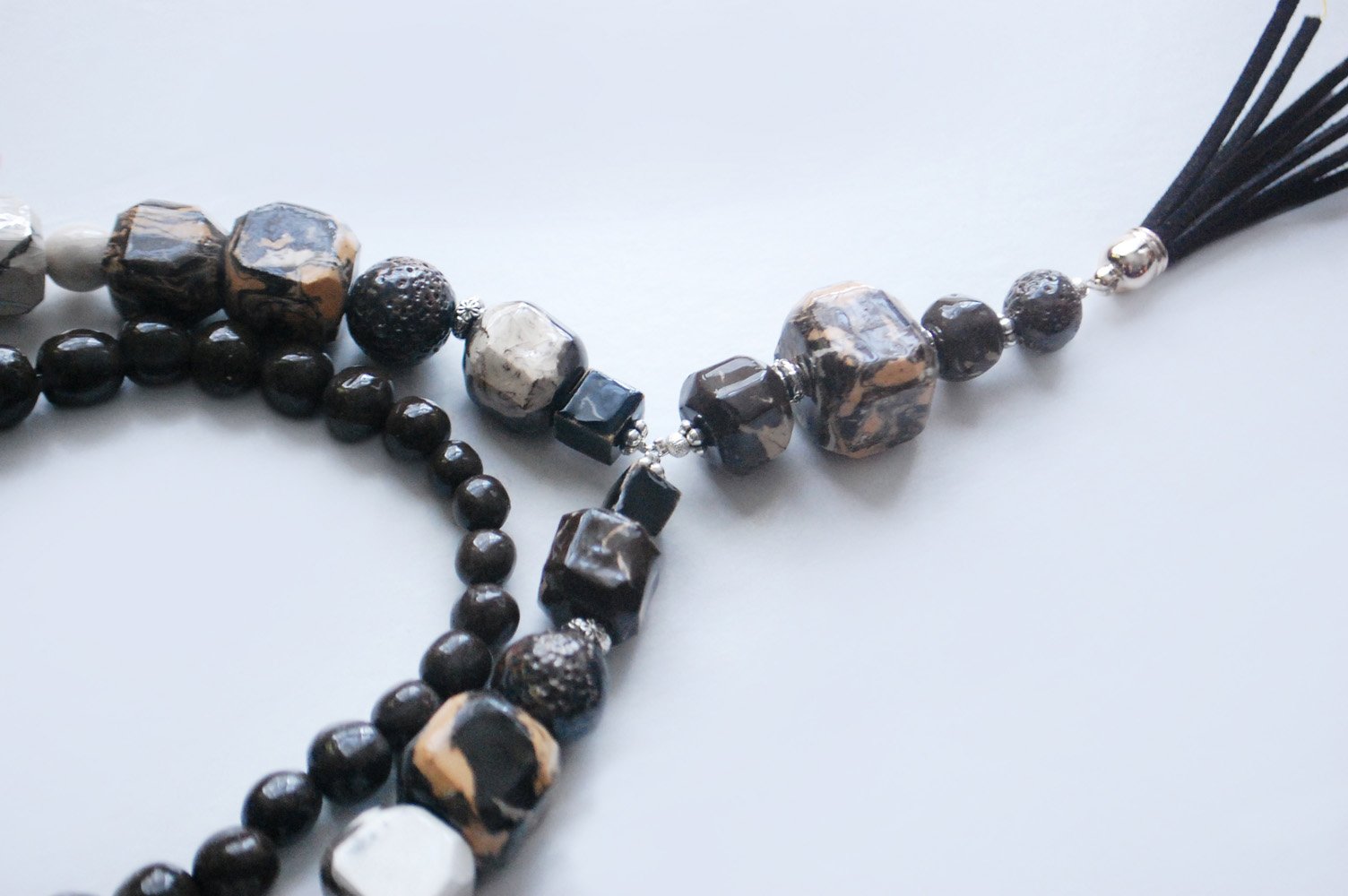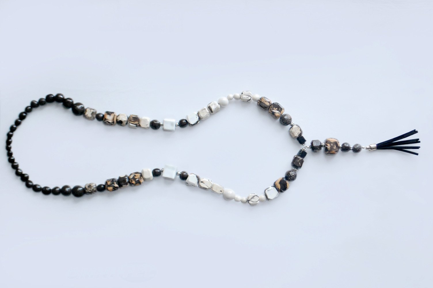 Dalis karolių dekoruoti platinos liustru, vėrinys puoštas stambiu kutosu iš dirbtinės odos juostelių. Papuošalui puošnumo suteikia marmuriniai karoliai, pagaminti pagal japonišką molio maištymo tecnologiją, taip išgaunant unikalius ir vienetinius marmuro raštus ir naujus atspalvius. Marmuro raštai pabėžiami kai kuriuos karolius dekoruojantplatinos gyslelįmis ir kraklė glazūra. Keramikos karoliai, derinami su sidabro spalvos žalvarinėmis detalėmis.