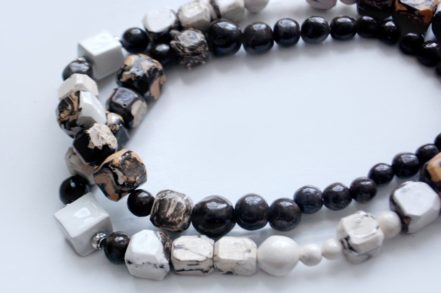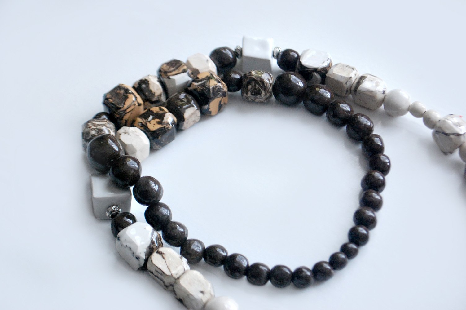 Rudai baltas , raštuotas, vėrinys su platinos gyslelėmis. Vėrinyje derinami net aštuonių skirtingų rūšių karoliai: šokoladiniai ir pieno spalvos apvalūs, briaunuoti marmuriniai pieno spalvos su rudomis gyslelėmis, briaunuoti marmuriniai šokolado spalvos su baltomis ir kreminėmis gyslelėmis, briaunuoti marmuriniai ochros spalvos su rudomis ir kreminėmis gyslelėmis, stambūs balti ir smulkūs juodi kvadratiniai, rudi, primenantys lavos uolienas. Kiekvienas karoliukas kruopščiai nulipdytas ir išskaptuotas rankomis, sukuriant vienetines faktūras ir papuošalui suteikiant išskirtinumo.