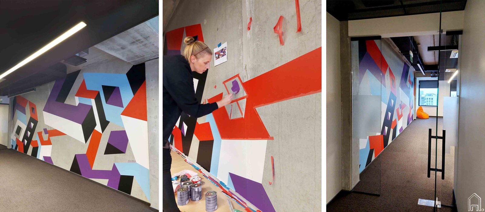 Ryškiaspalvis geometrinis piešinys, įgyvendintas moderniame IT paslaugas teikiančios įmonės UAB "Softeta" biure. Efektingas piešinys atliktas tarpusavyje komponuojant ir derinant penkias įmonės firminio stiliaus spalvas.