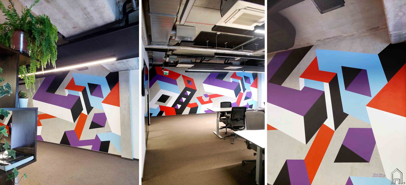 Geometrinis piešinys puikiai įsikomponuoja šiuolaikiškoje, urbanistinio stiliaus biuro erdvėje, ją pagyvinas, atkartodamas geometrines, firminiam stiliui būdingas detales ir formuoja naujas struktūras.