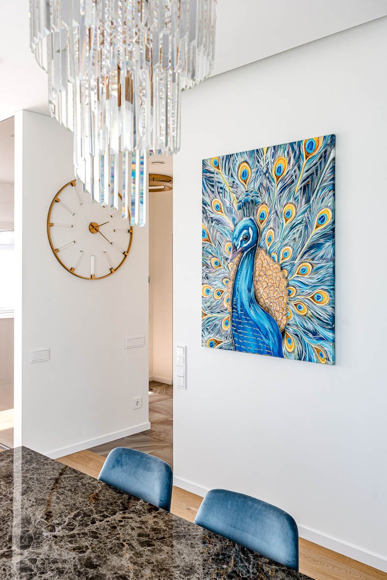 Daugelį savo plunsnų grožiu žavintis paukštis povas - įspūdingas laimės sergėtojas, didybės ir grožio simbolis, povo atvaizdas namams atneša laimę, klestėjimą ir sėkmę. Paveikslas su šiuo didingu paukščiu tapo šviesaus modernios klasikos interjero akcentu.