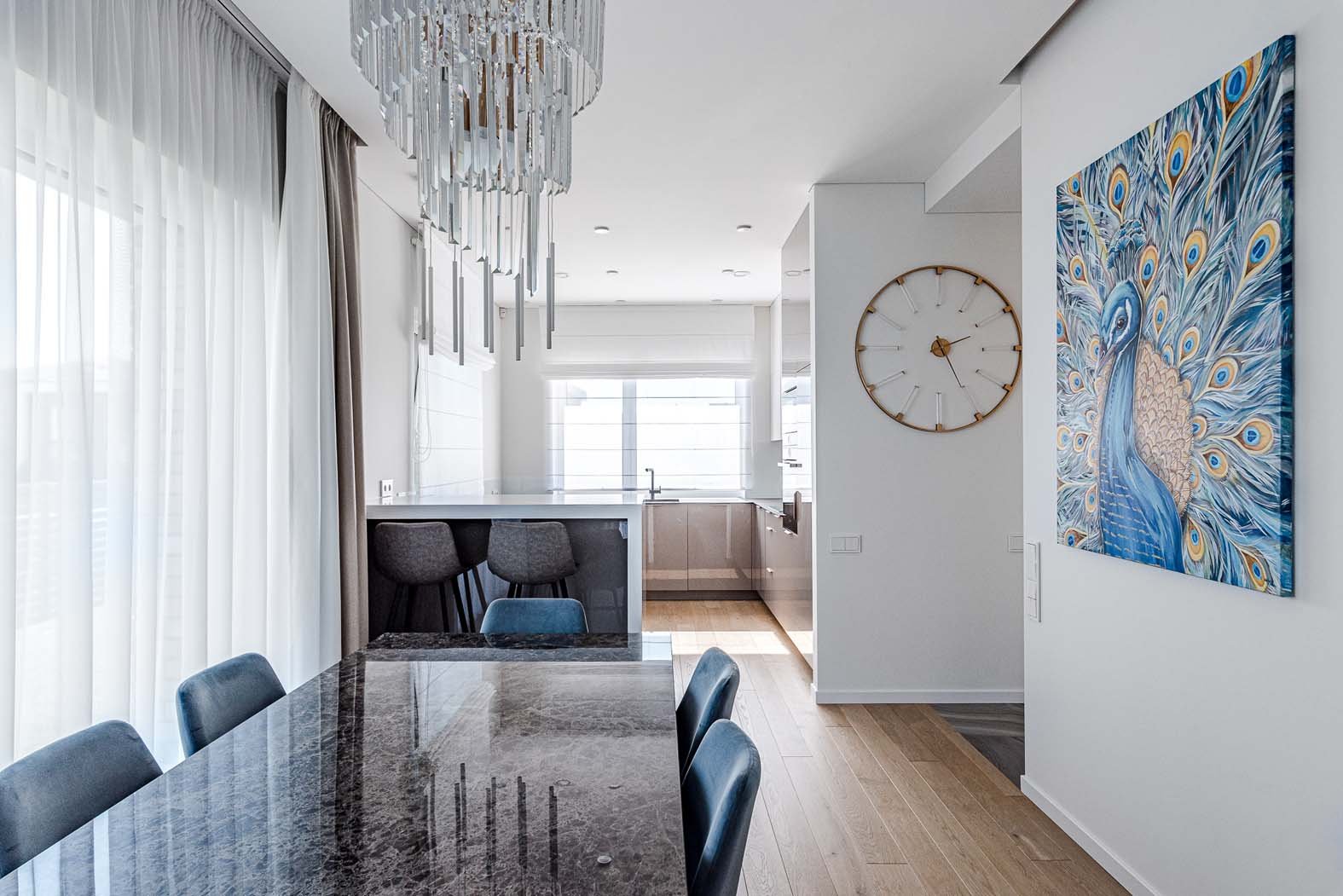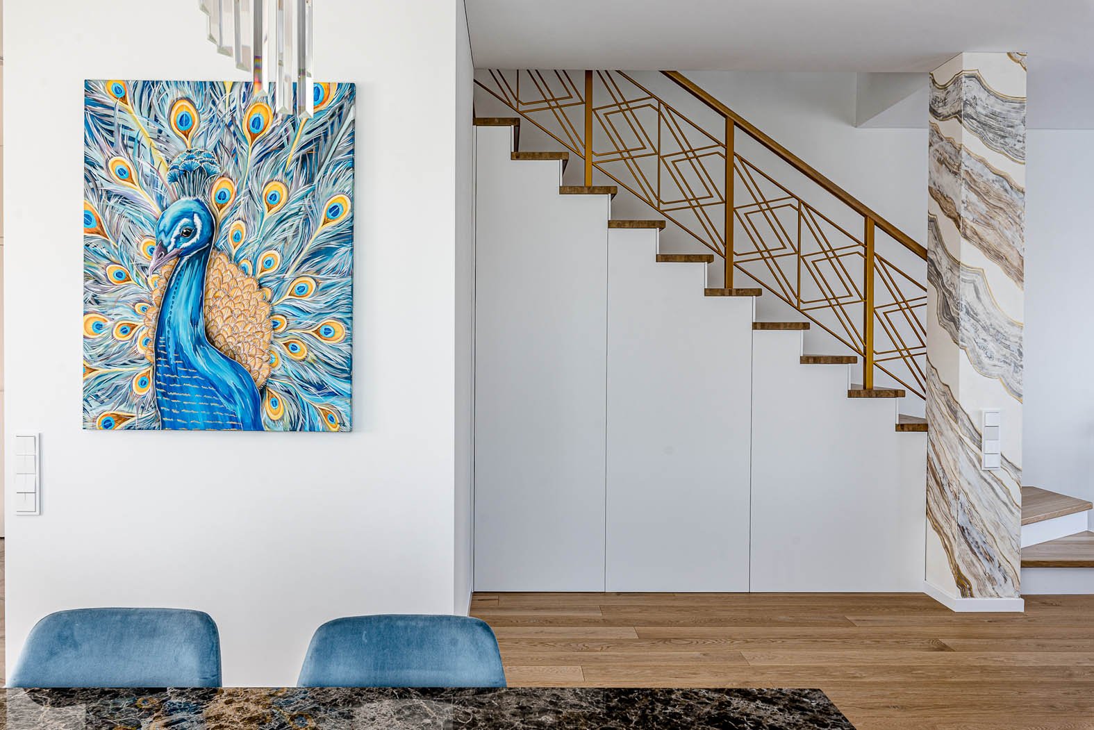 Mėlyni paveikslo apalviai apjungia į bendrą visumą svetainės ir virtuvės erdves, dera prie mėlynų tonų minkštų svetainės ir valgomojo baldų, rusvi atspalviai derinami prie grindų, plytelių ir laiptų.