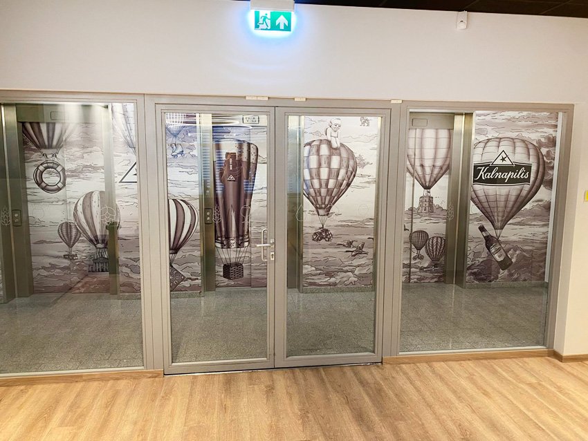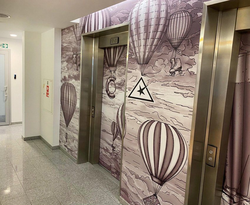 Kodėl gi liftų nepavertus meno kūriniu?! Iliustracija su padebesiais skrendančių balionų piešiniu perkelta į užsakovo darbo erdvę. Puikus pavizdys, kaip piešiniai gali pagyvinti ne tik mūsų namus bet ir erdvę, kurioje kasdien dirbame.