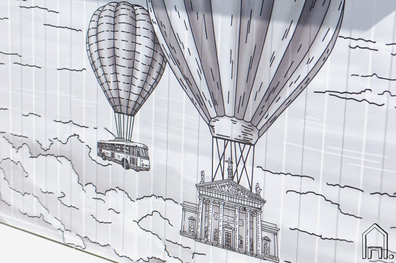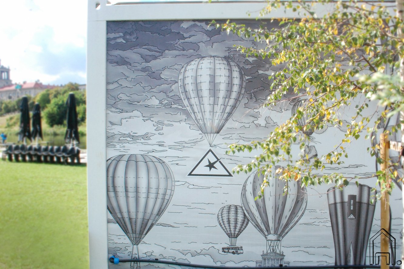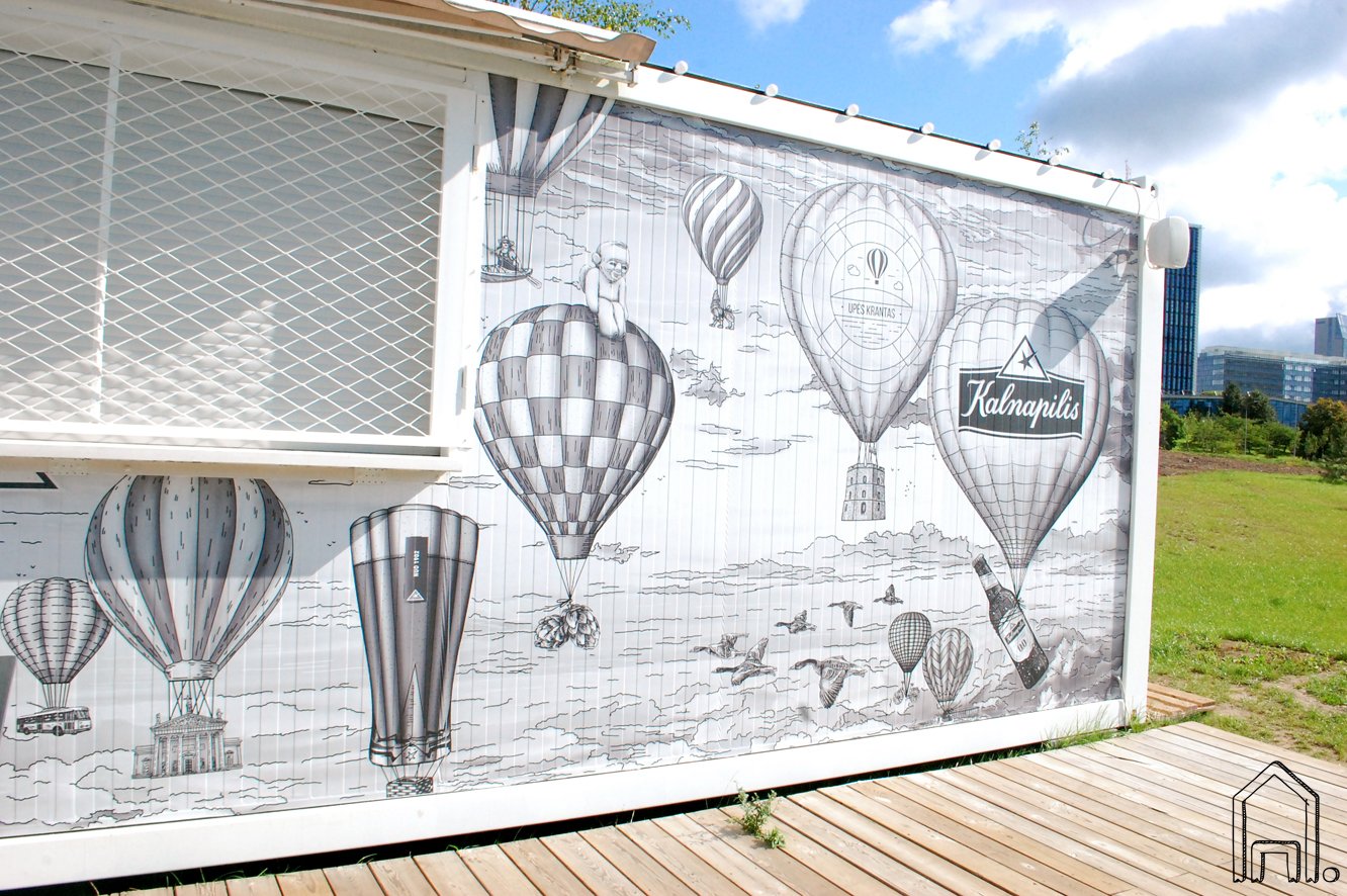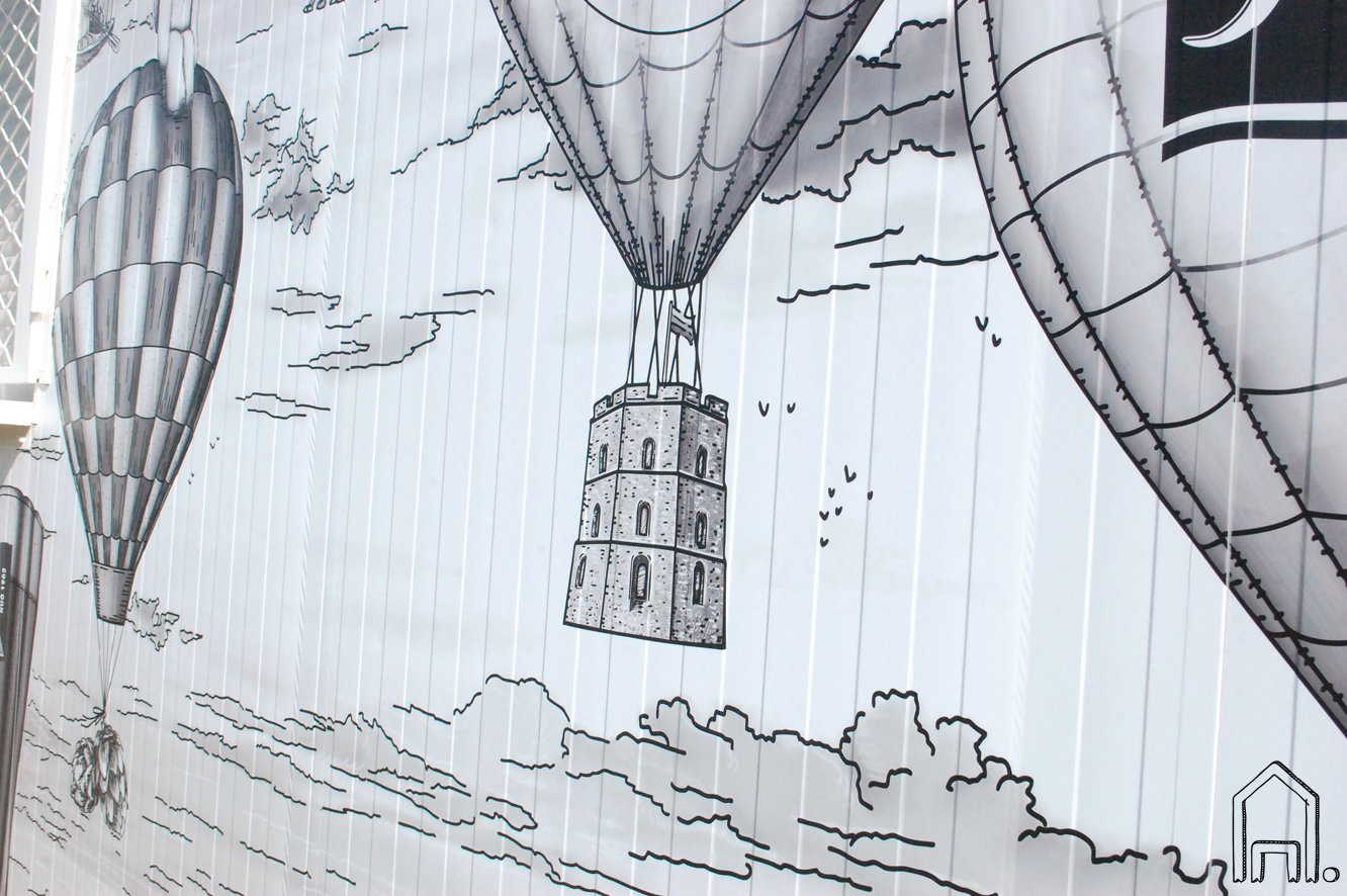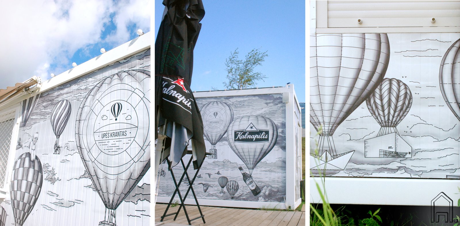 Idėją piešiniui pasufleravo pati baro lokacija, jis įsikūręs greta didelės pievos kurioje kas vakarą į orą pakyla gausybė spalvingų balionų.Tad ir ant baro fasado "nusileido" debesuotas dangus įvairiausiais oro balionais.