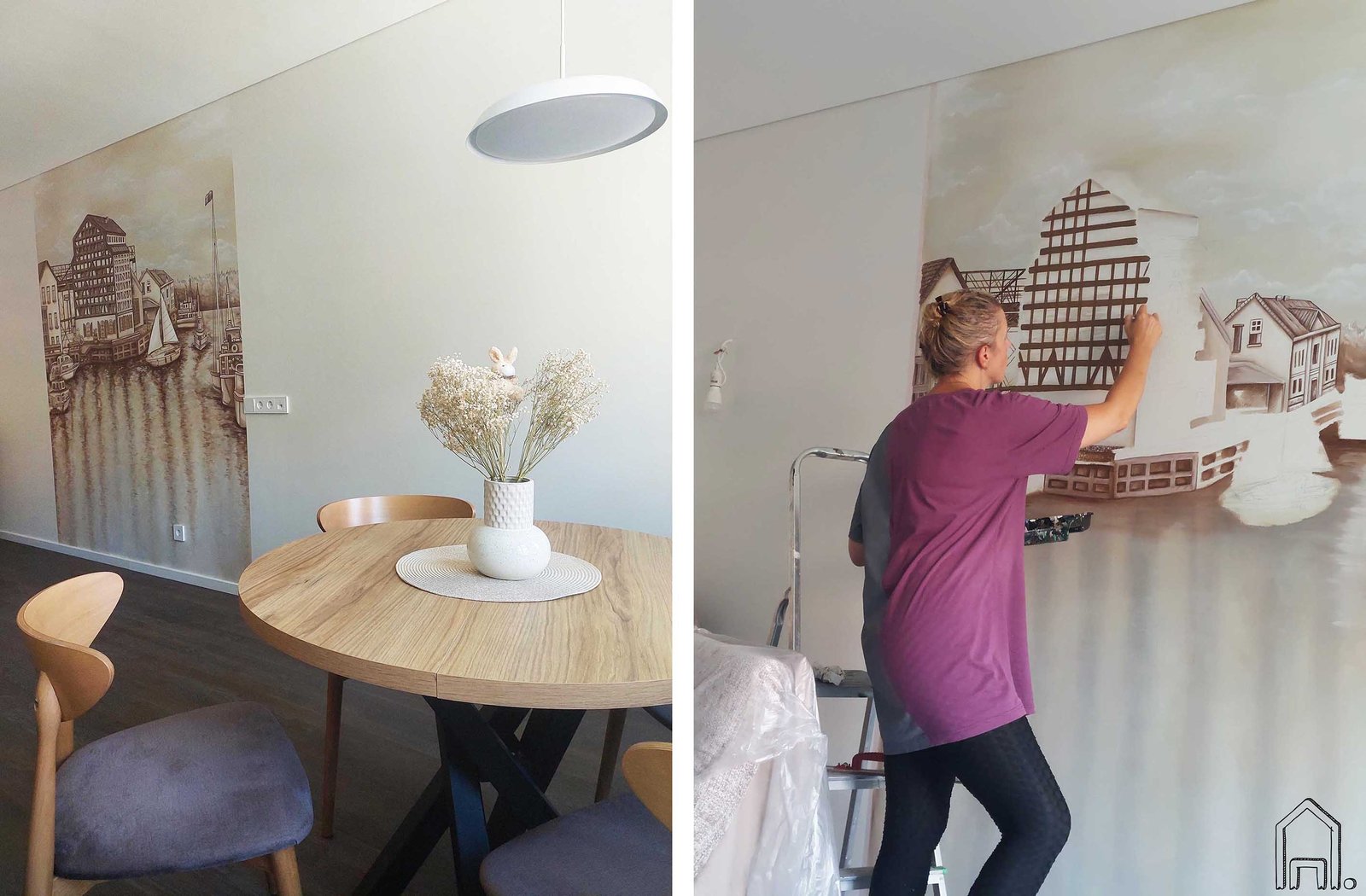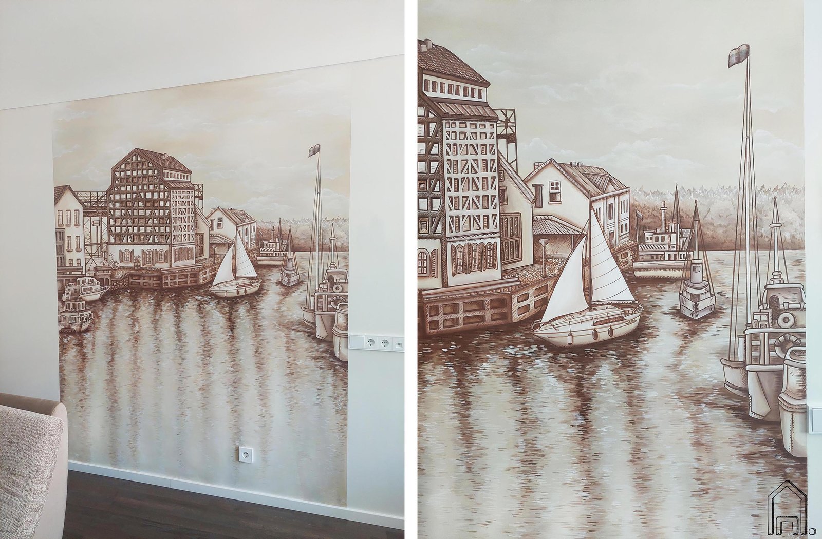 Naujai įrengto buto svetainės sieną papuošė rusvų tonų Klaipėdos senamiesčio peizažas. Piešinyje vaizduojama Danės upė ir jos krantai.