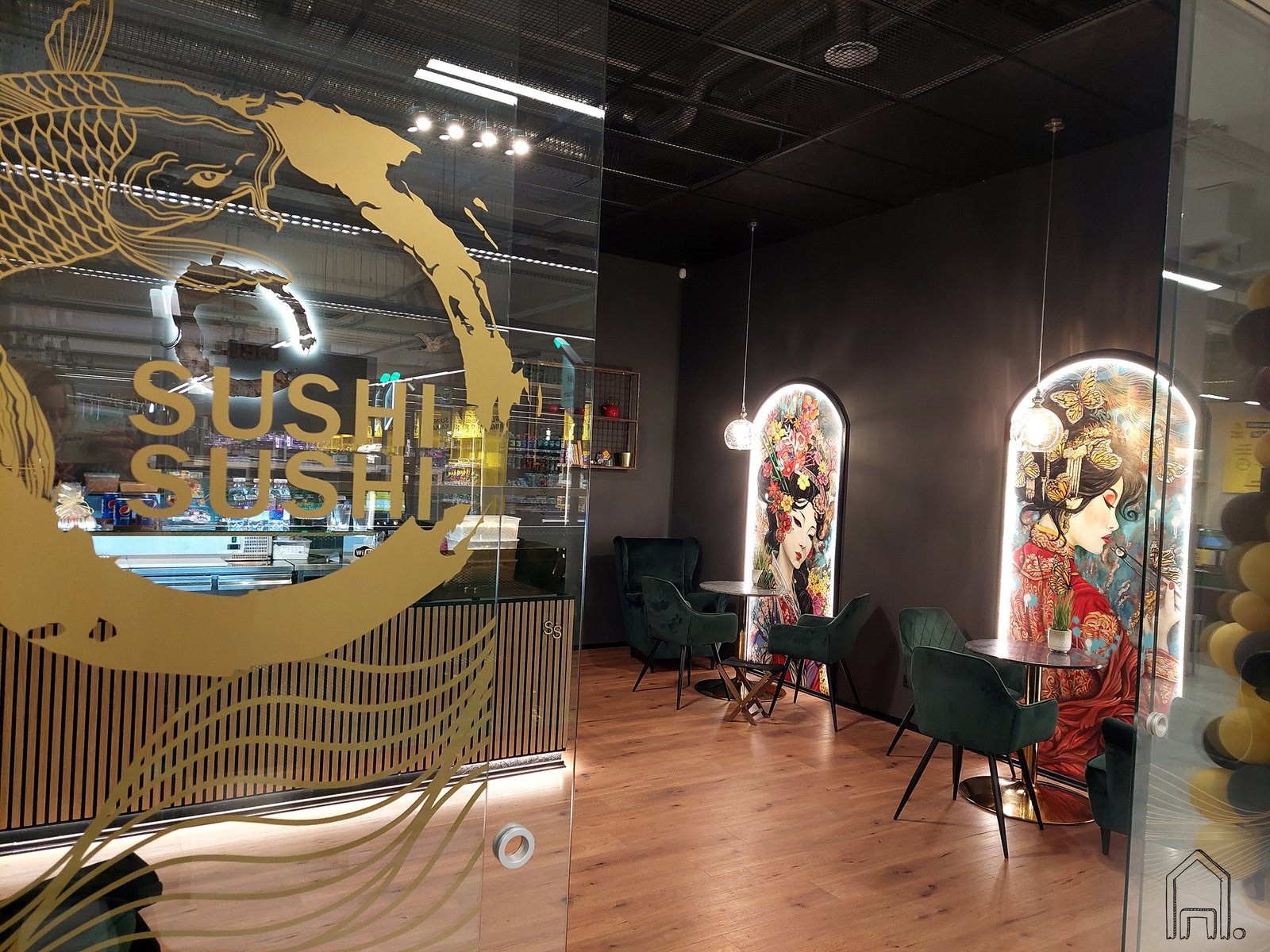 Prekybos centre "Pupa" atsidariusiame restorane "Sushi sushi" nutapyti du įspūdingi geišų portretai. Itin spalvingi portretai - ryšiausias dekoro elementas restorane.