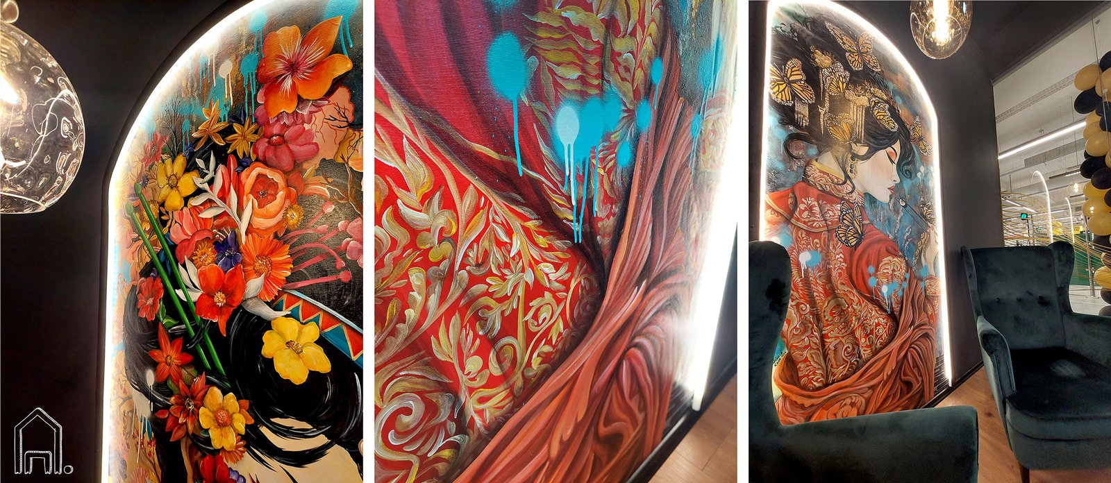 Restorano interjeras - subtilus, neperkrautas. Tamsiai pilkos sienos, tamsiai žali baldai, Subtilios auksinės detalės. Tuo tarpu geišų portretai alsuoja spalvomis, fone susipina skirtingos faktūros, tapybai naudota mišri technika: įvairiomis technikomis išgautos reljefinės faktūros, auksu žvilgančios smulkios dekoratyvios detalės kontrastuoja su purškiamų aerozolio dažų paliktais varvančiais elementais.