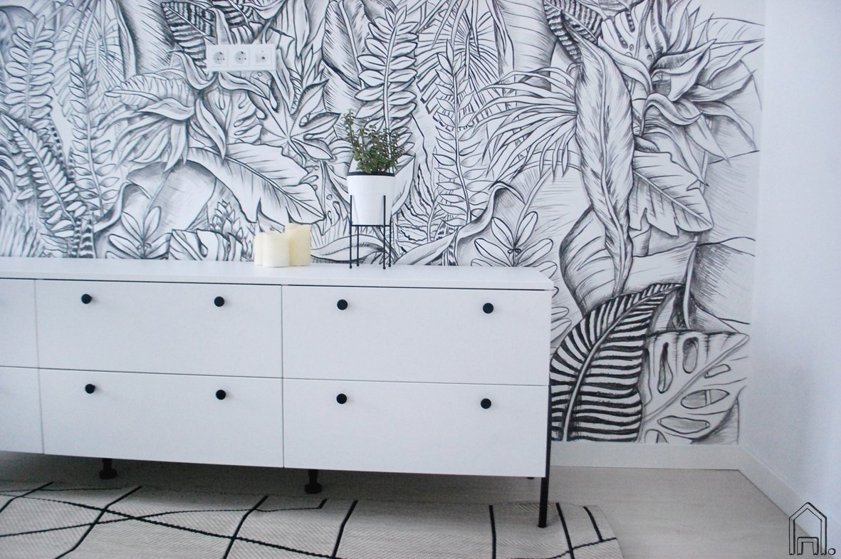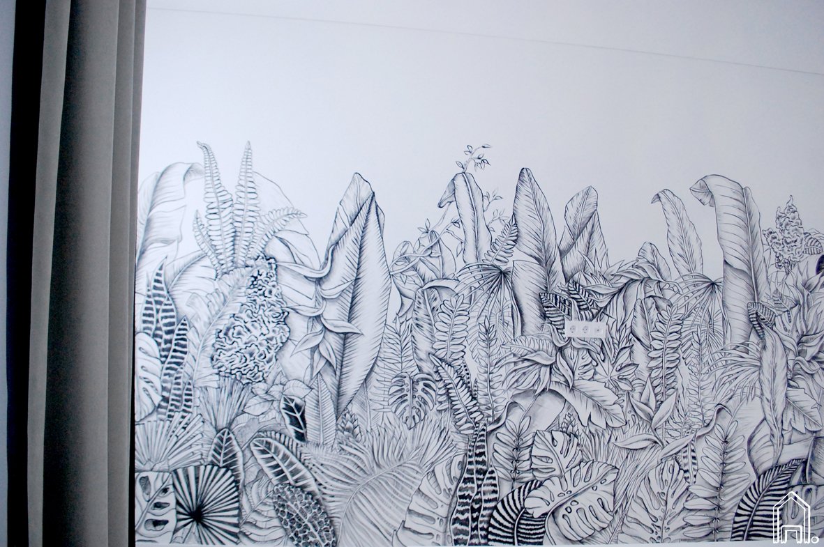 Juodai baltas tropinių augalų piešinys įgyvendintas pagal interjero dizainerės viziją, sukurtas miegamojo erdvei. Jau tapo įprasta miegamajame išskirtine ir akcentine siena pasirinkti esančią lovos galvūgalyje. Minimalistišką, grafišką interjerą kūrusiai dizainerei kilo mintis piešiniu papuošti didžiausią kambario sieną, kad į piešinį būtų galima žvelgti gulint lovoje, ar prisėsti šalia esančiame fotelyje paskaityti..