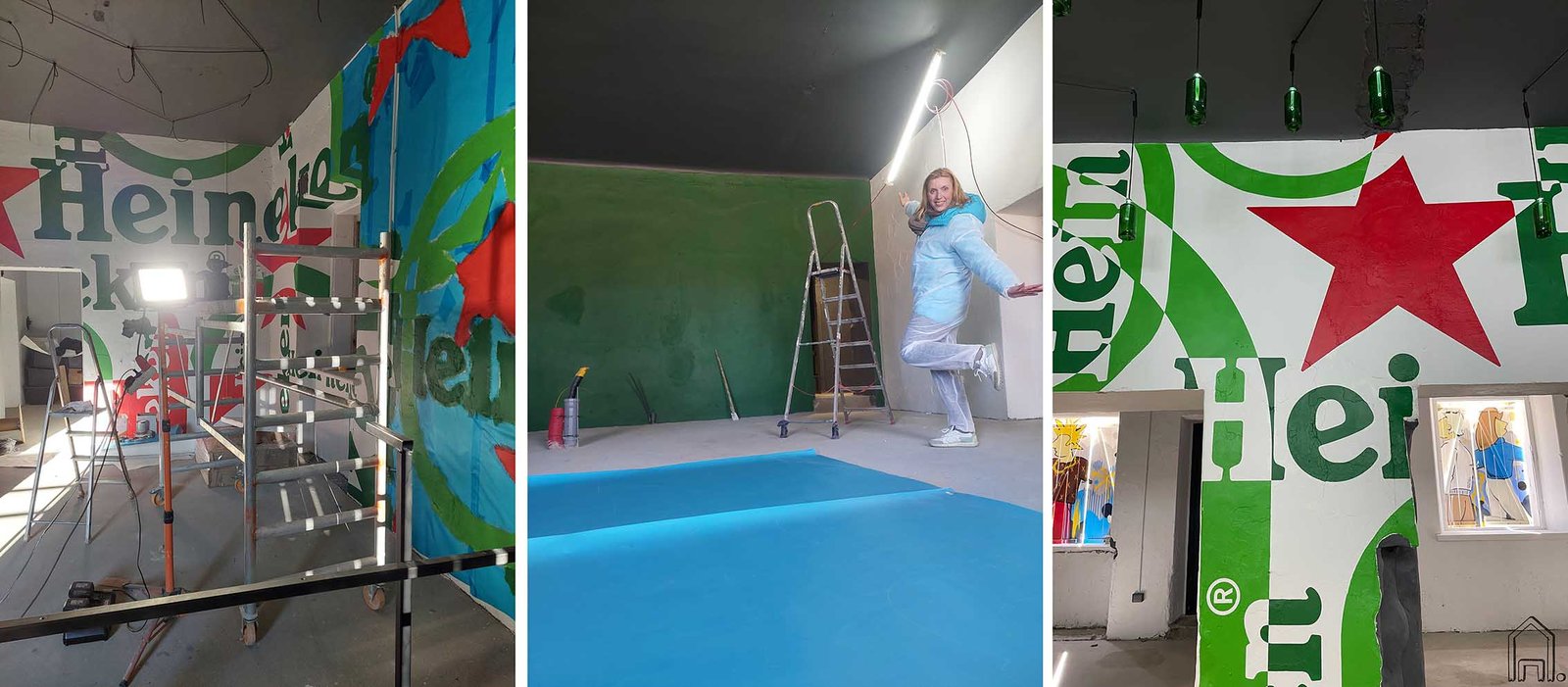 Išskirtinio, urbanistinio stiliaus baro interjere piešiniais dekoruotos kelios sienos.Stilingas interjeras sukurtas naudojant penkių spalvų paletę ir "Heineken" alaus logotipo dizaino variacijas.