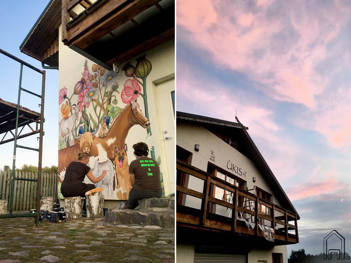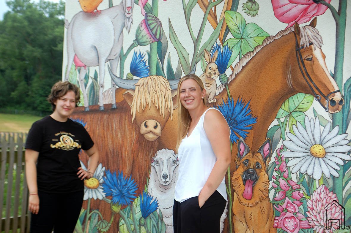 Gyvūnai sutūpę milžiniškų pievų augalų fone, lyg kokios pasakos gyventojai. Jei apsilankysite sodyboje, drąsiai stabtelėkite įsiamžinti šioje draugiškoje ir spalvingoje kompanijoje, ką baigusios piešti padarėme ir mes!