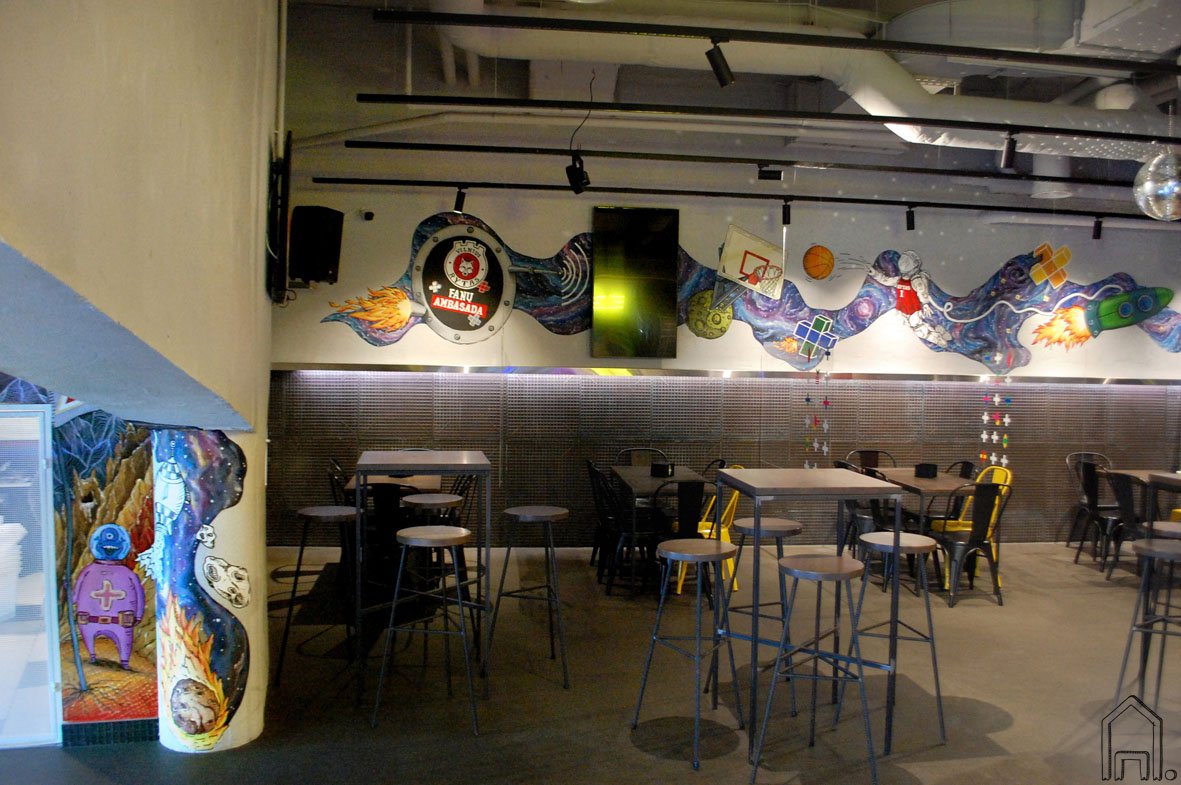 Fanų ambasados erdvėje, kaip ir piešinyje nutapytame ant lubų, skraido spalvingi meteorai, o iš skaisčiai žalios raketos į kosmoso erdvę išskridęs astronautas, apsivilkęs "Ryto" marškinėliais "deda" kamuolį į krepšį.