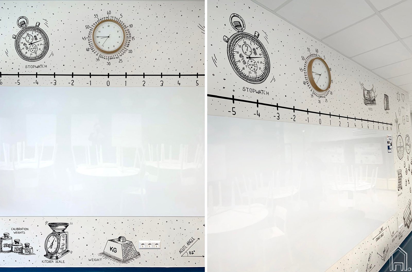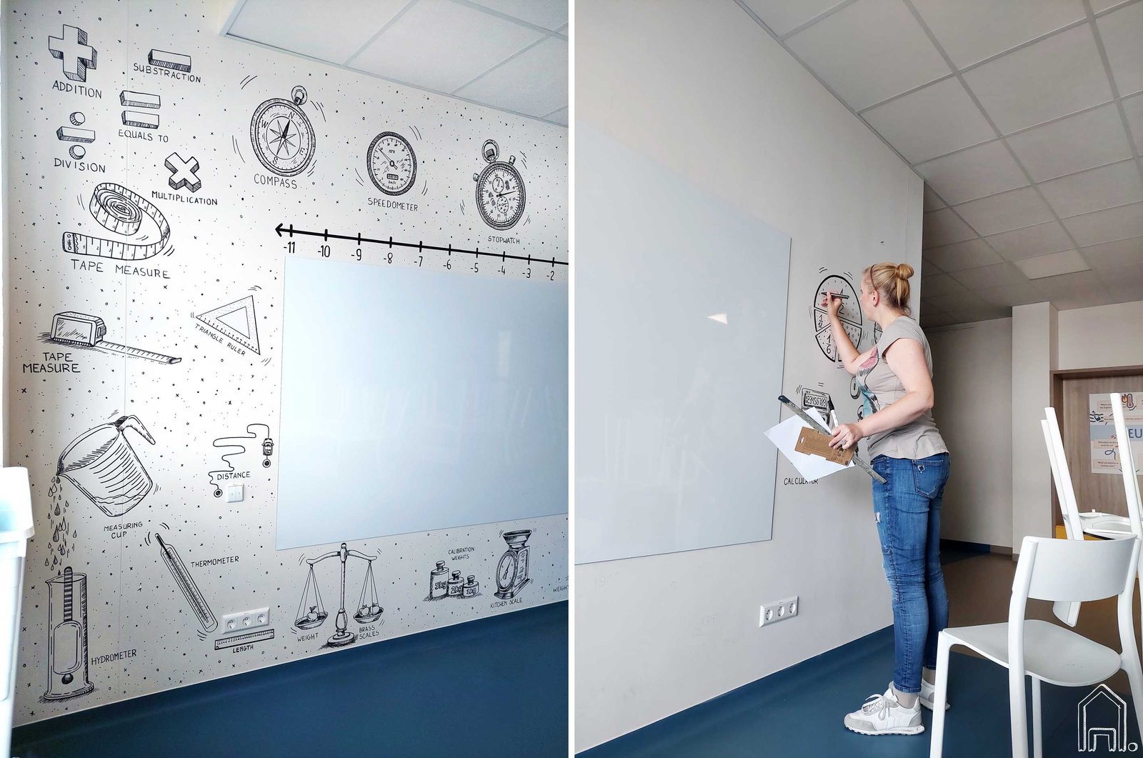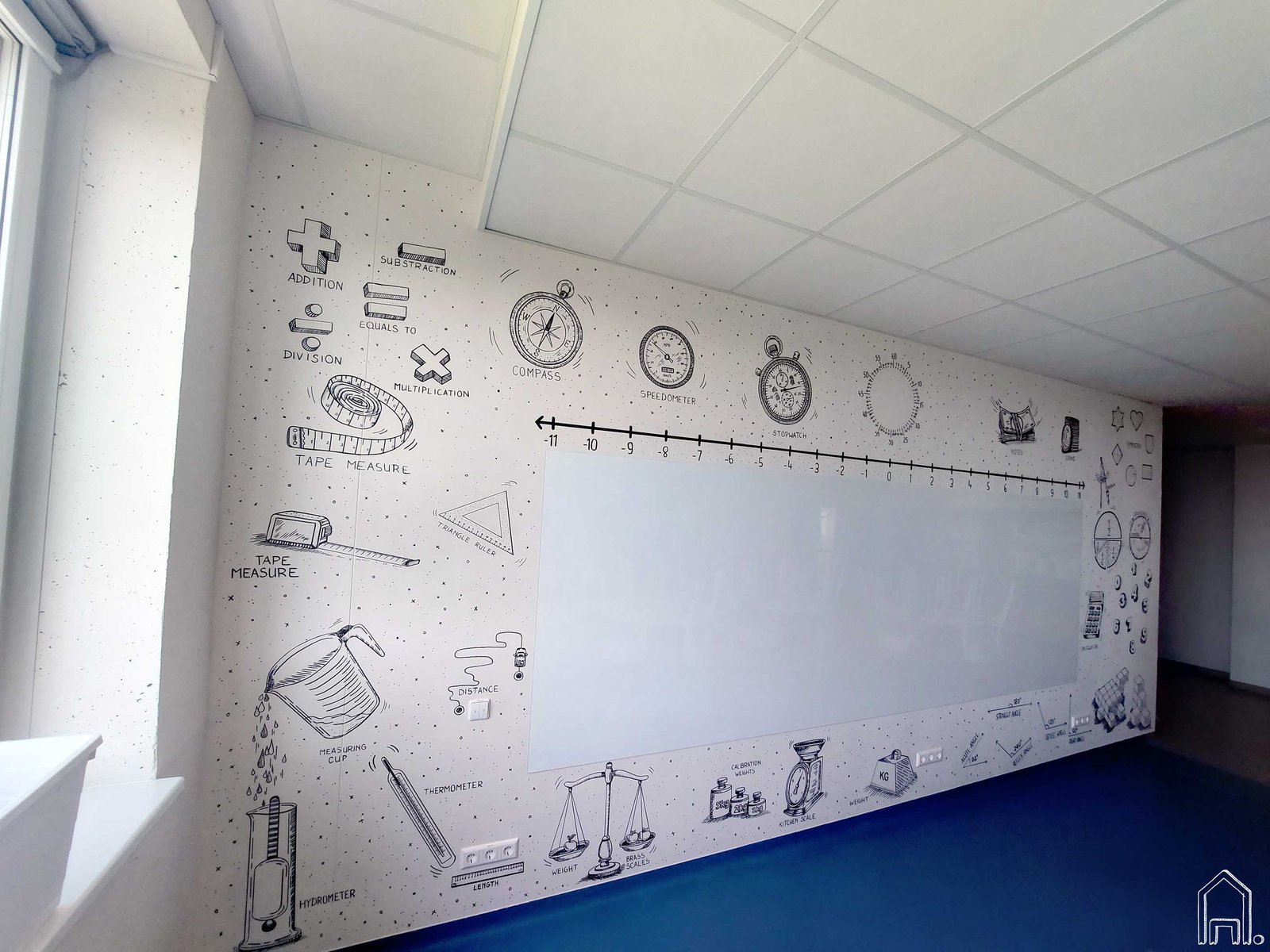 Vilniaus Karalienės Mortos mokykloje įkurta nauja Kembridžo mokyklos erdvė - matematikos studija. Pagrindinė studijos siena su mokykline lenta papuošta grafiškais piešiniais. Juodai balta, linijinė piešimo technika pasirinkta tęsiant KMM anksčiau įgyvendintų piešinių grafišką stilistiką.