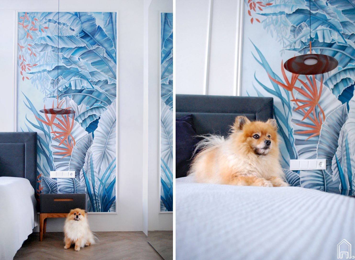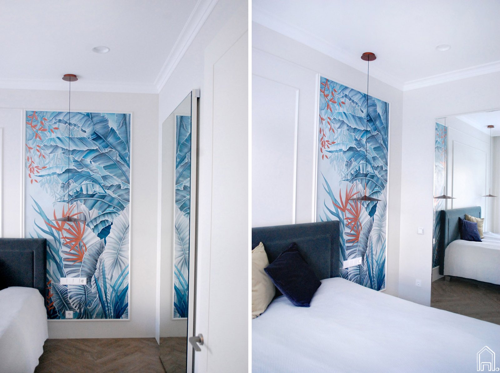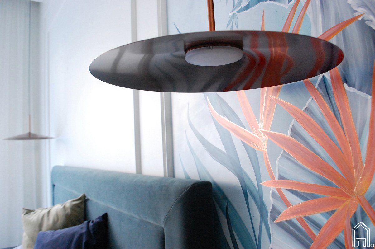 Išradingas interjero dizainerės sprendimas - slankiojančios veidrodinės berėmės drabužinės durys optiškai padidina miegamojo erdvę, suformuoja papildomą erdvės šviesos šaltinį (natūrali dienos šviesa sklindanti pro langus atsispindi veidrodyje ir pasklinda po visą miegamojo erdvę) bei atspindi ištapytą piešinį. Taip piešinys "pratęsiamas" ant kitos miegamojo sienos.