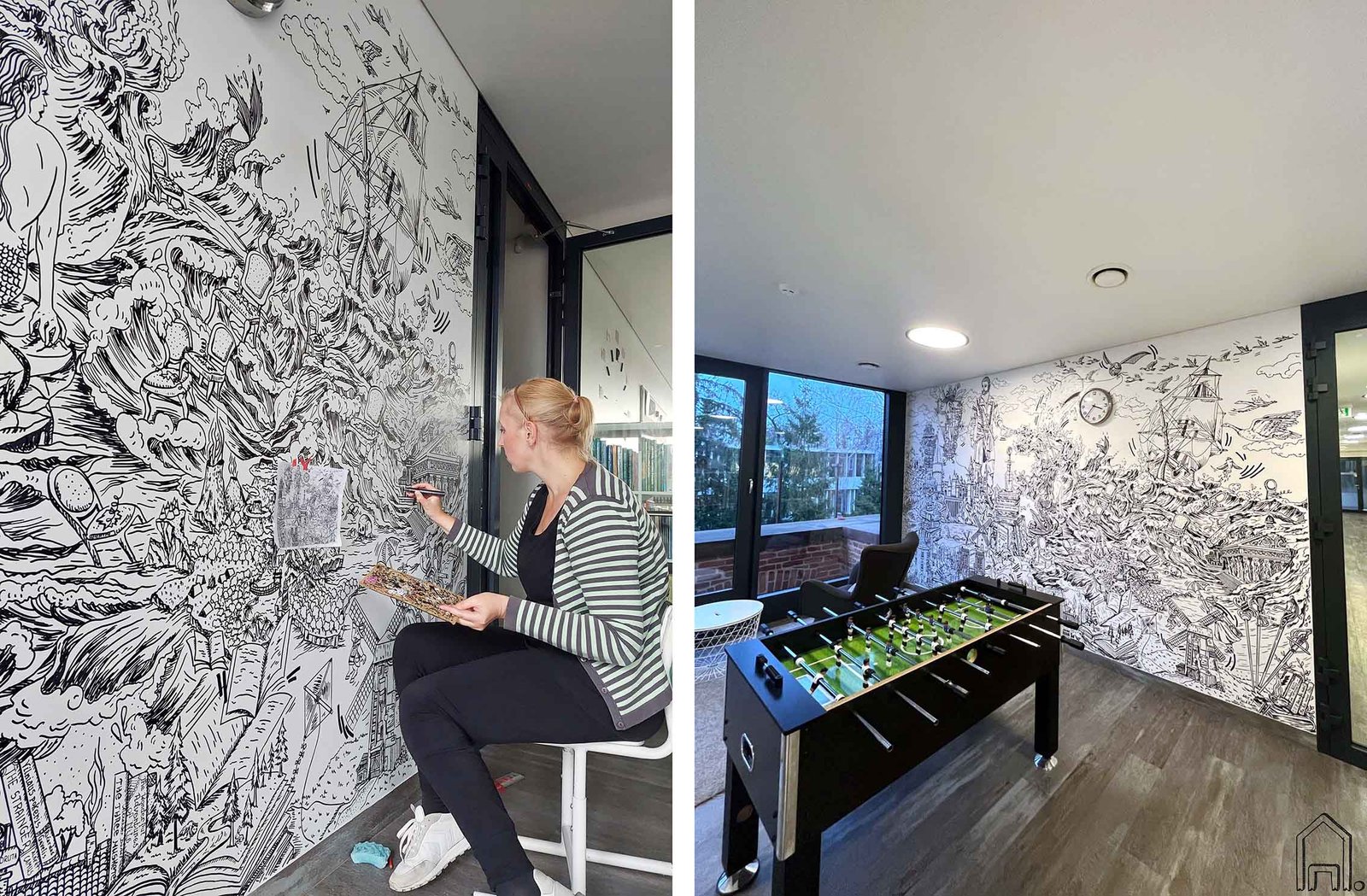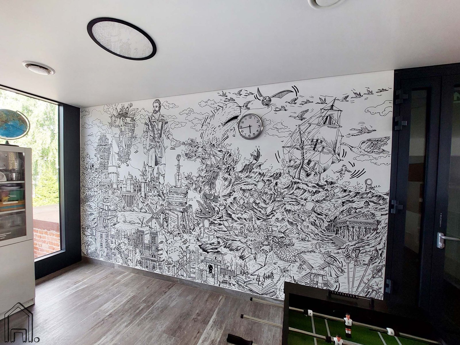 Dinamiškame, akyse raibuliujančiame piešinyje galima atrasti tiek didelių tiek mažųjų pamėgtas knyjas ir jų ikoniškus veikėjus ar magiškas vietas. Nuo Atlantidos iki Hogvartso, nuo muminukų namo iki Paryžiau katedros. Klaidžiojant akimis po piešinį galima pastebėti Vėjyje skrendantį išdykėlį Totoro, Baltaragio malūno sparnų sukurtame vėjyje skrendančią Mere Popins, į audringą jūrą žvelgiančią mažąją undinėlę, bei iš tykaus ežero gelmių išnirusią mistišką Lochneso pabaisą.