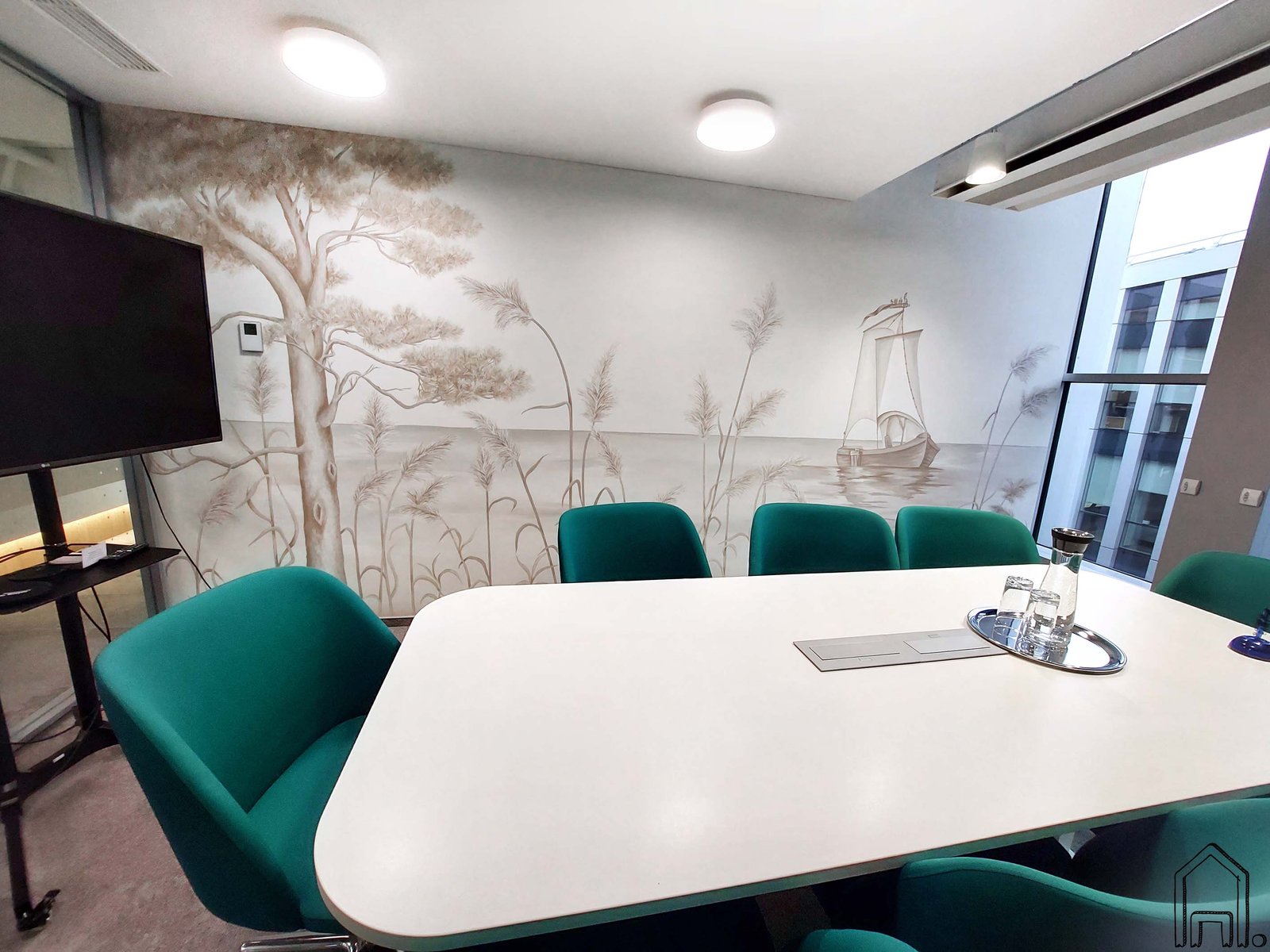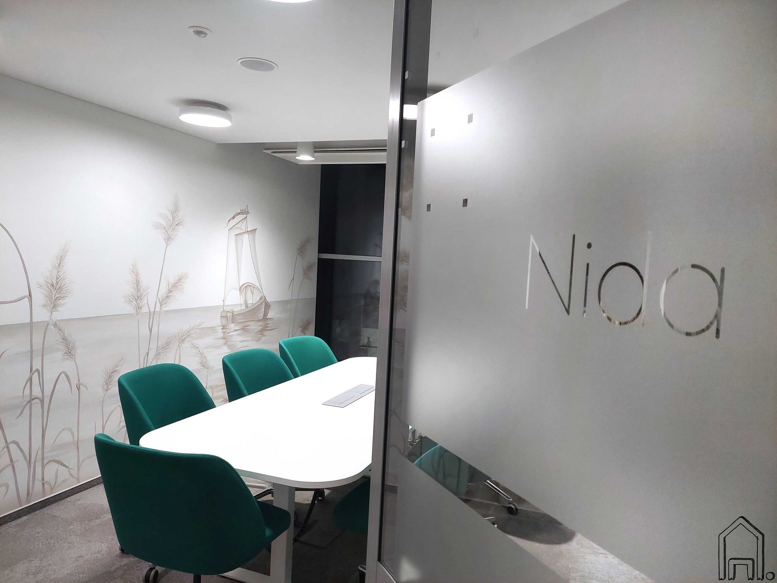 Pilkšvai rusvų tonų piešinys, nutapytas įmonės Alna Business Solutions posėdžių kambaryje, pavadintame "Nida". Modernaus stiliaus įmonės interjerui pagyvinti ir norint erdvei suteikti jaukumo ir šilumos pasirinktas stilizuotas lietuviško pajūrio peizažas.