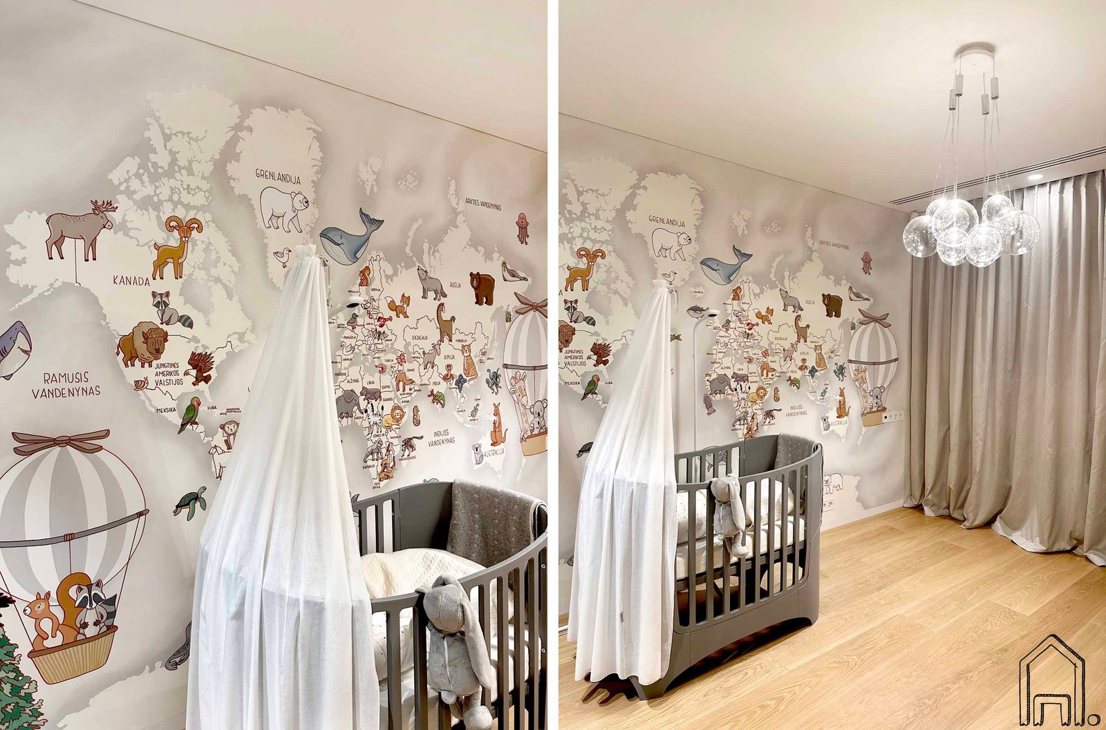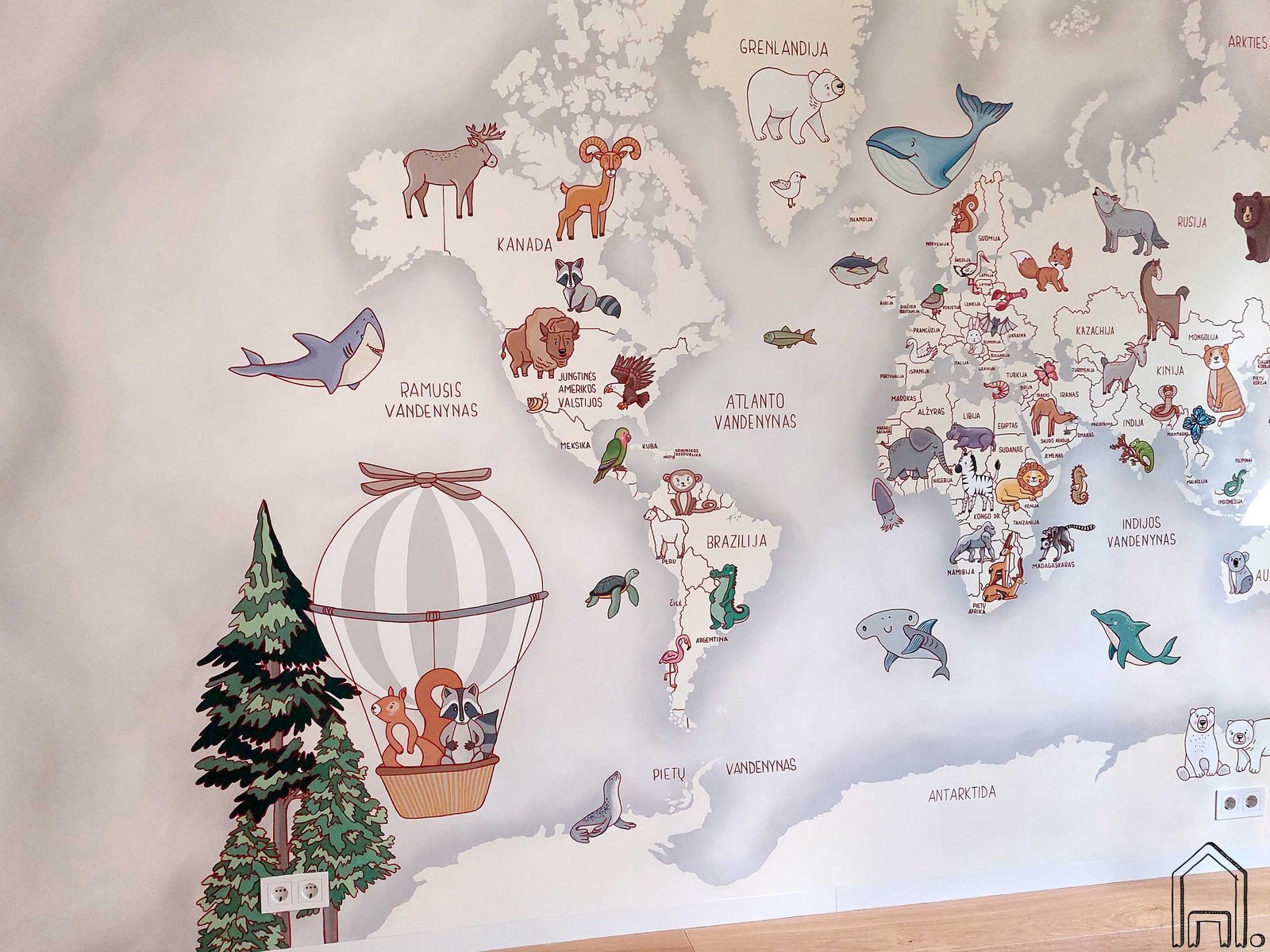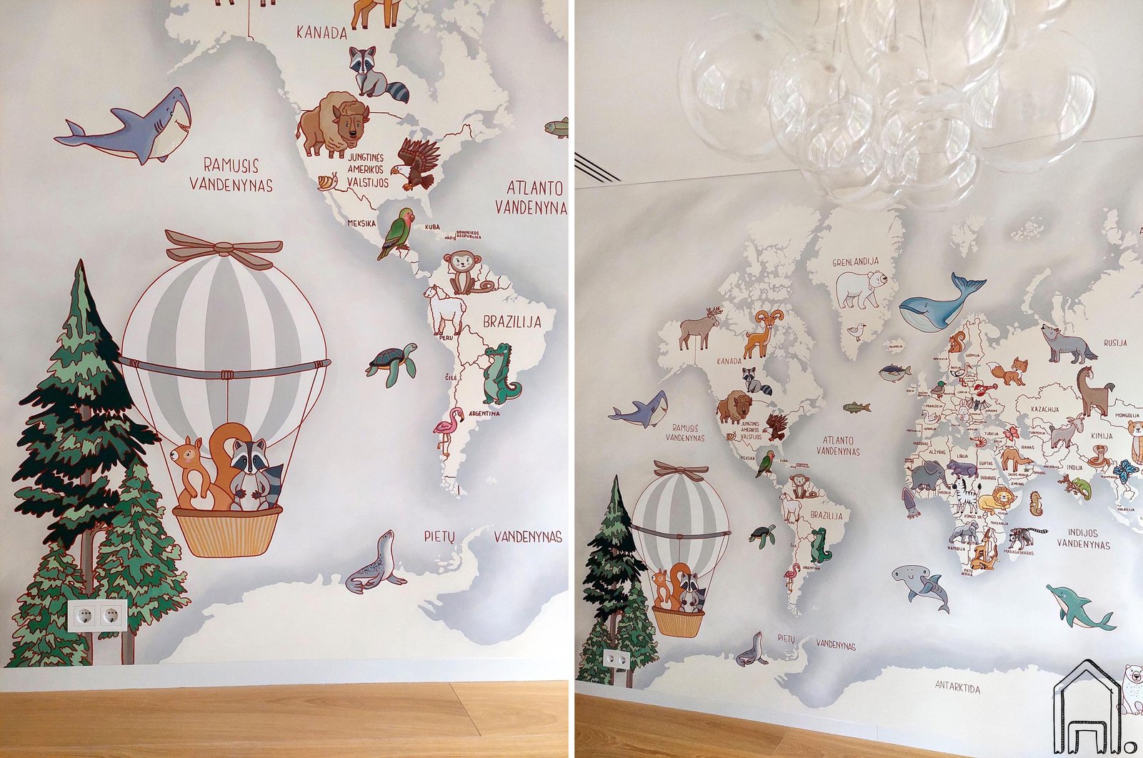 Siena su pasaulio žemėlapiu tapo dailiu vaiko kambario akcentu. Piešinyje taip pat pavaizduoti dekoratyvūs oro balionai, krepšeliuose skraidinantys linksmus gyvūnėlius iš skirtingų pasaulio regionų.