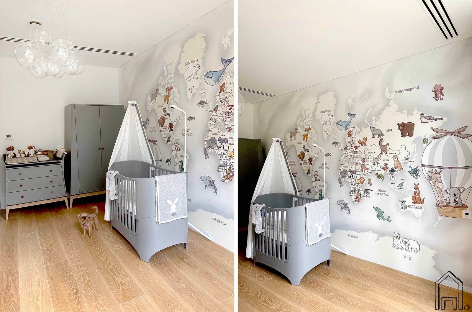 Klientų namuose, mažylio kambaryje nutapytas pasaulio žemėlapio piešinys. Piešinio pagrindui pasirinktos pilka ir gelsva spalvos. Pilki fono šėšėliai derinti prie giminingo atspalvio baldų.