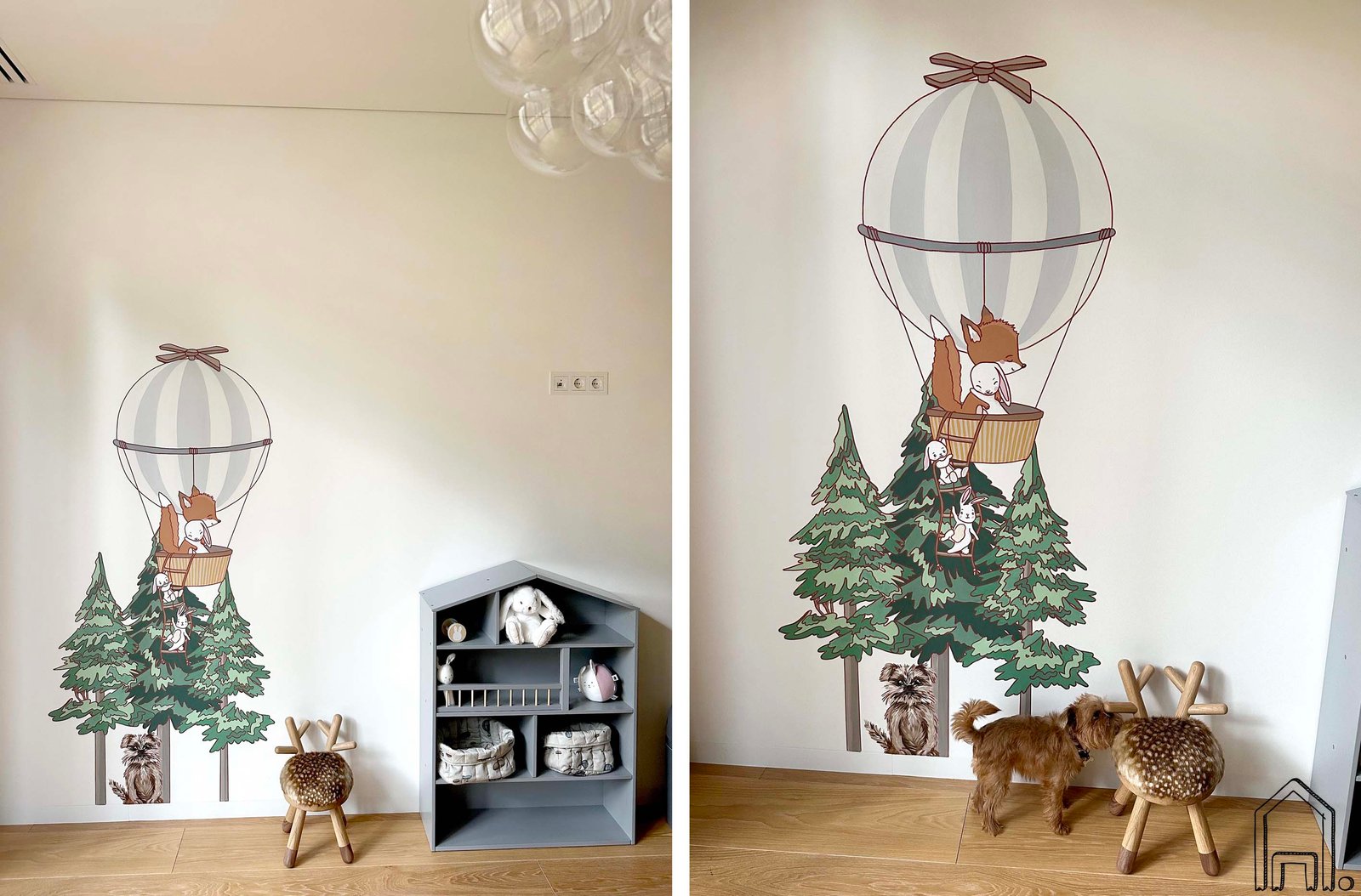 Taip pat dalis piešinio, kaip akcentinis tęsinys persikėlė ant kitos kambario sienos. Smagi detalė - po viena iš eglučių "apsigyveno" pieštas šeimininkų šunelis Lulu.