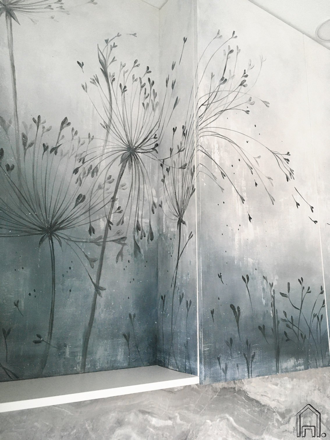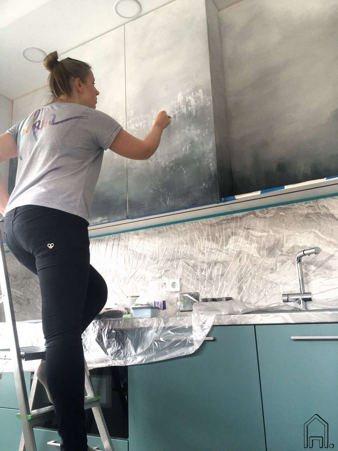 Modernaus ir stilingo interjero akcentas - abstraktus švelnių atspalvių piešinys virtuvės erdvėje. Ši tapybiška abstrakcija atlikta dekoruojant virtuvės baldo plokštes.
