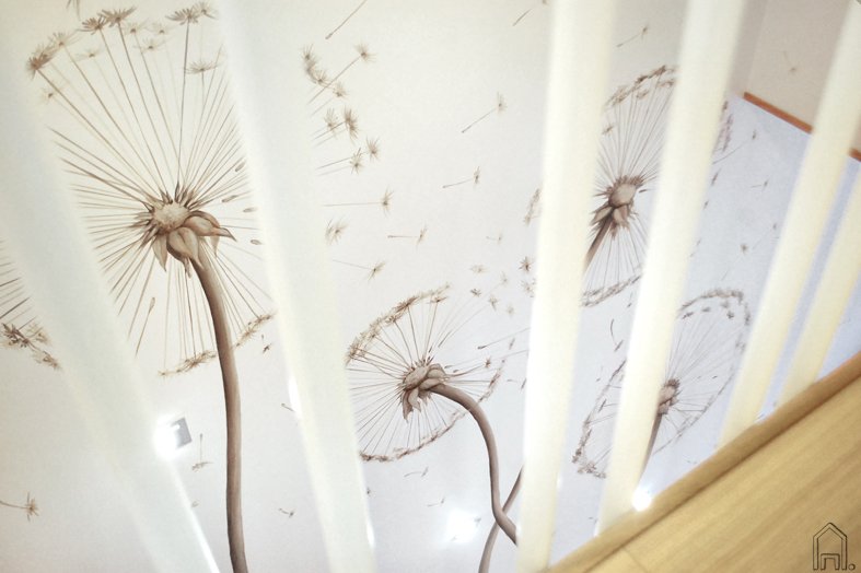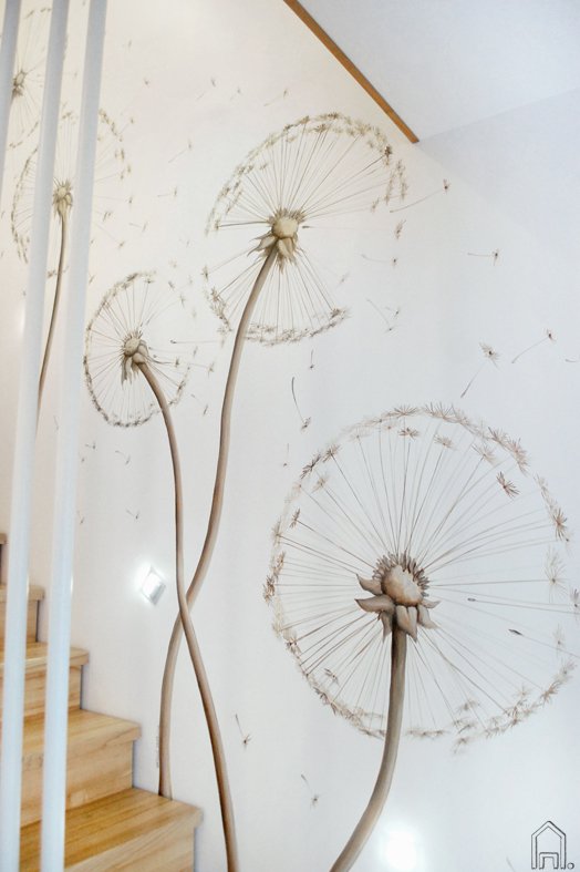 Piešinio atspalviai derinti prie medinių laiptų spalvų gamos. Švelnus ir lengvas pienių pūkų motyvas užpildo erdve, bet jos neapsunkina. Mažyčiai ir didesni pūkeliai "skraido" sienų paviršiumi ir kyla į antro aukšto erdvę.