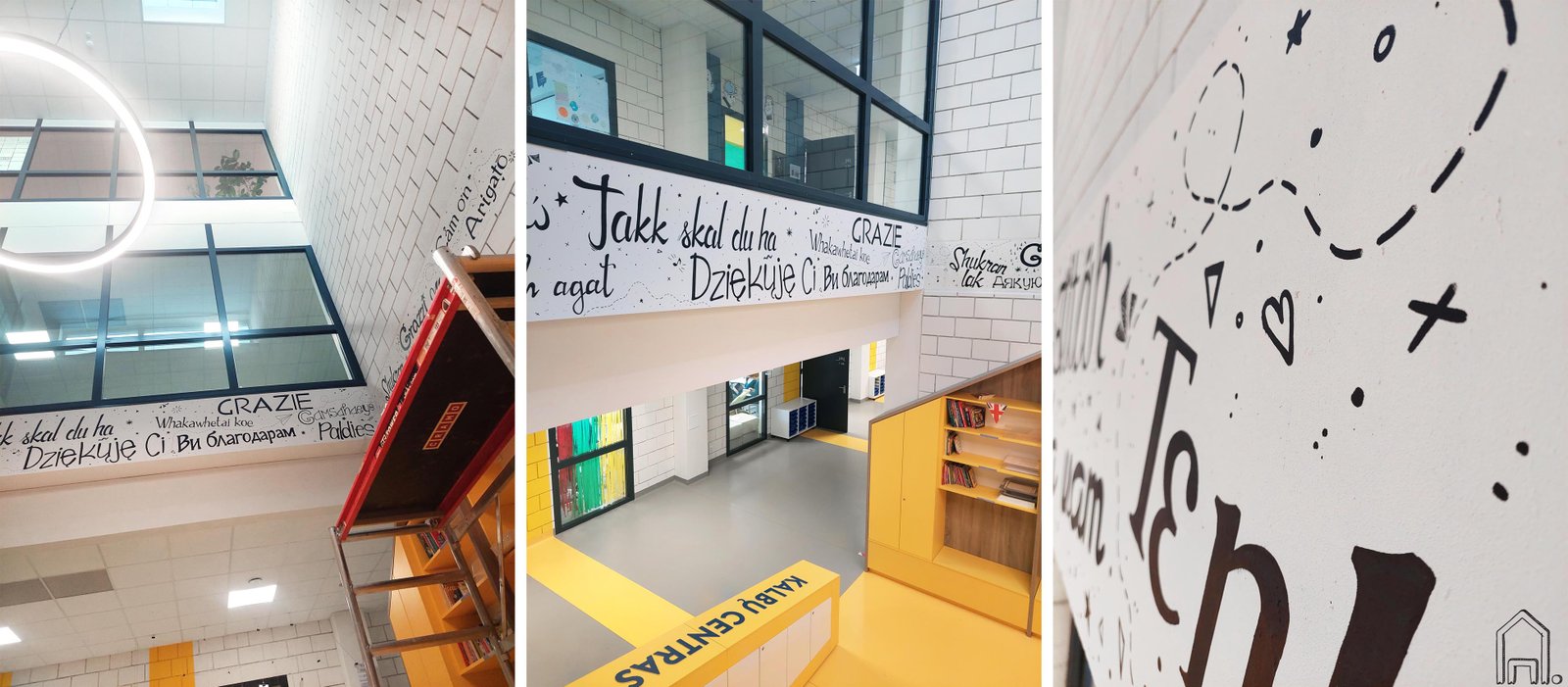 Vilniaus Karalienės Mortos Mokykloje grafiškais piešiniais pasipuošė Kalbų Centras. Mokyklos darbuotojos turėjo šaunią idėją įvairiomis kalbomis ant Kalbų Centrą juosiančių balkių užrašyti žodžius arba frazes. Kadangi piešinys turėjo atsirasti mokslui skirtoje erdvėje, norėta jį sukurti ne tik gražų, bet ir edukuojantį. Taigi iškėlėme klausimą, yra toks žodis, ar frazė, kurią mokiniams būtų naudinga pasakyti skirtingomis kalbomis?
