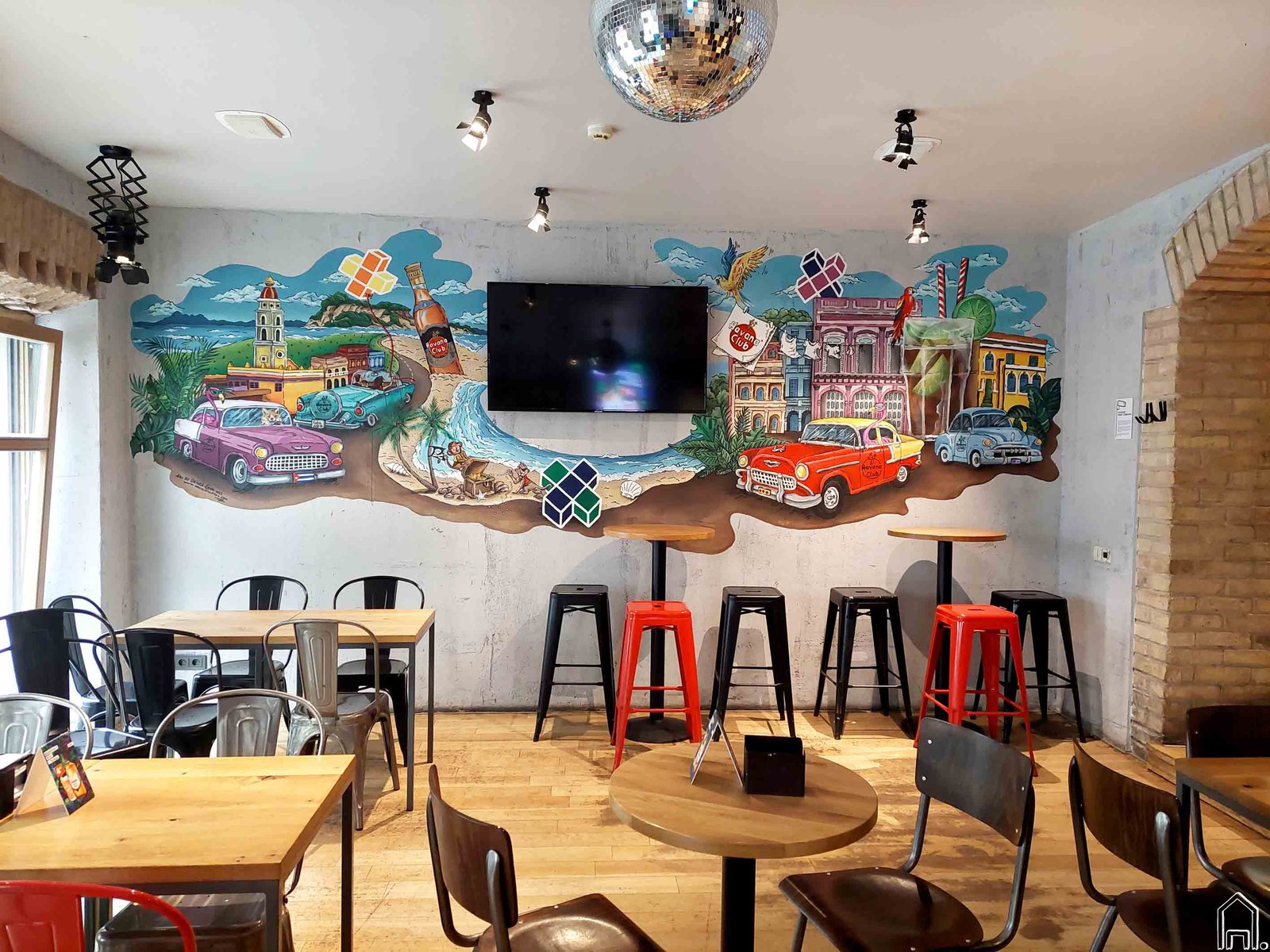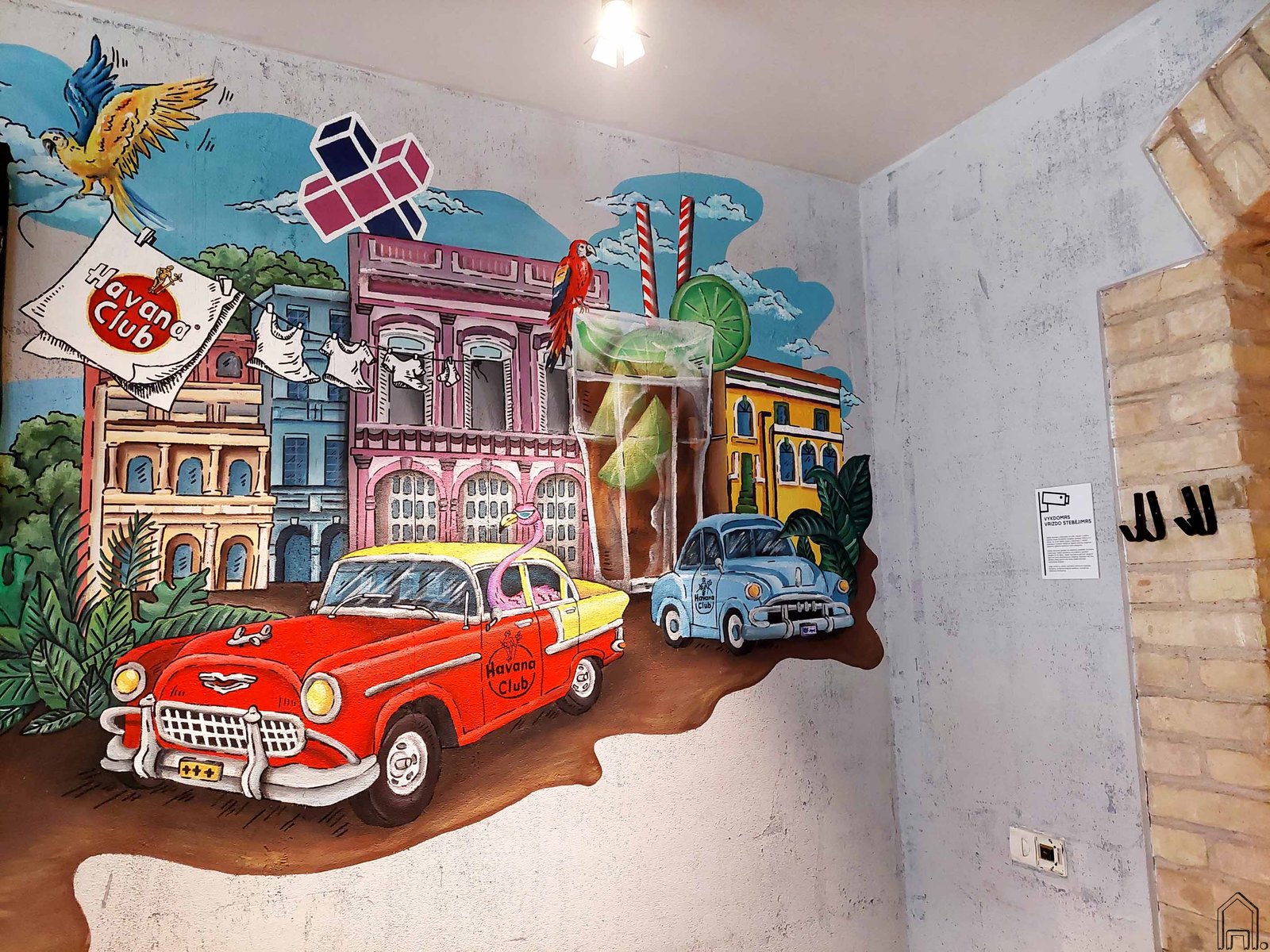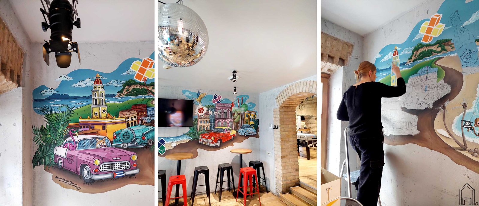 Trakų gatvėje, Vilniuje įsikūrusiame gastrobare "Plius Plius Plius" nutapytas spalvingas, kubietišką nuotaiką įliustruojantis piešinys. Piešinys nutapytas ant pilkos, faktūriniu tinku dengtos sienos, erdvei įnešė gyvybės ir žaismingumo.