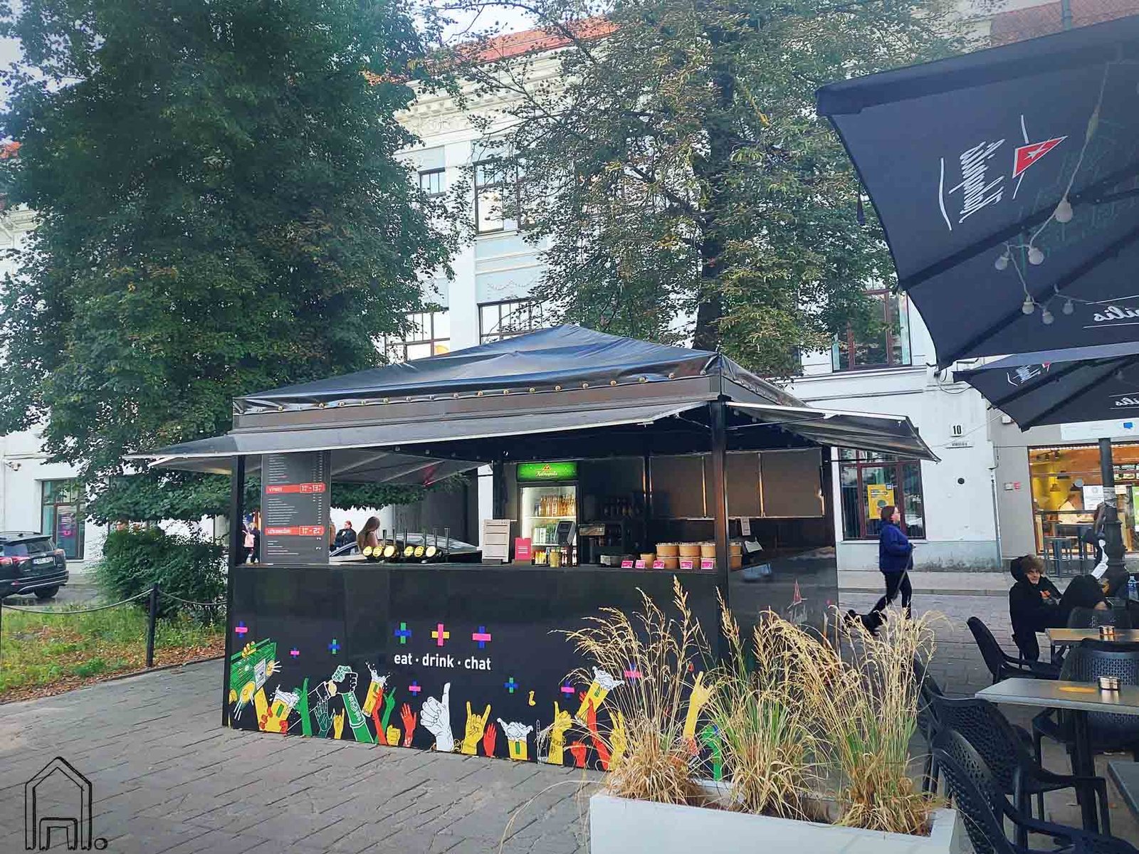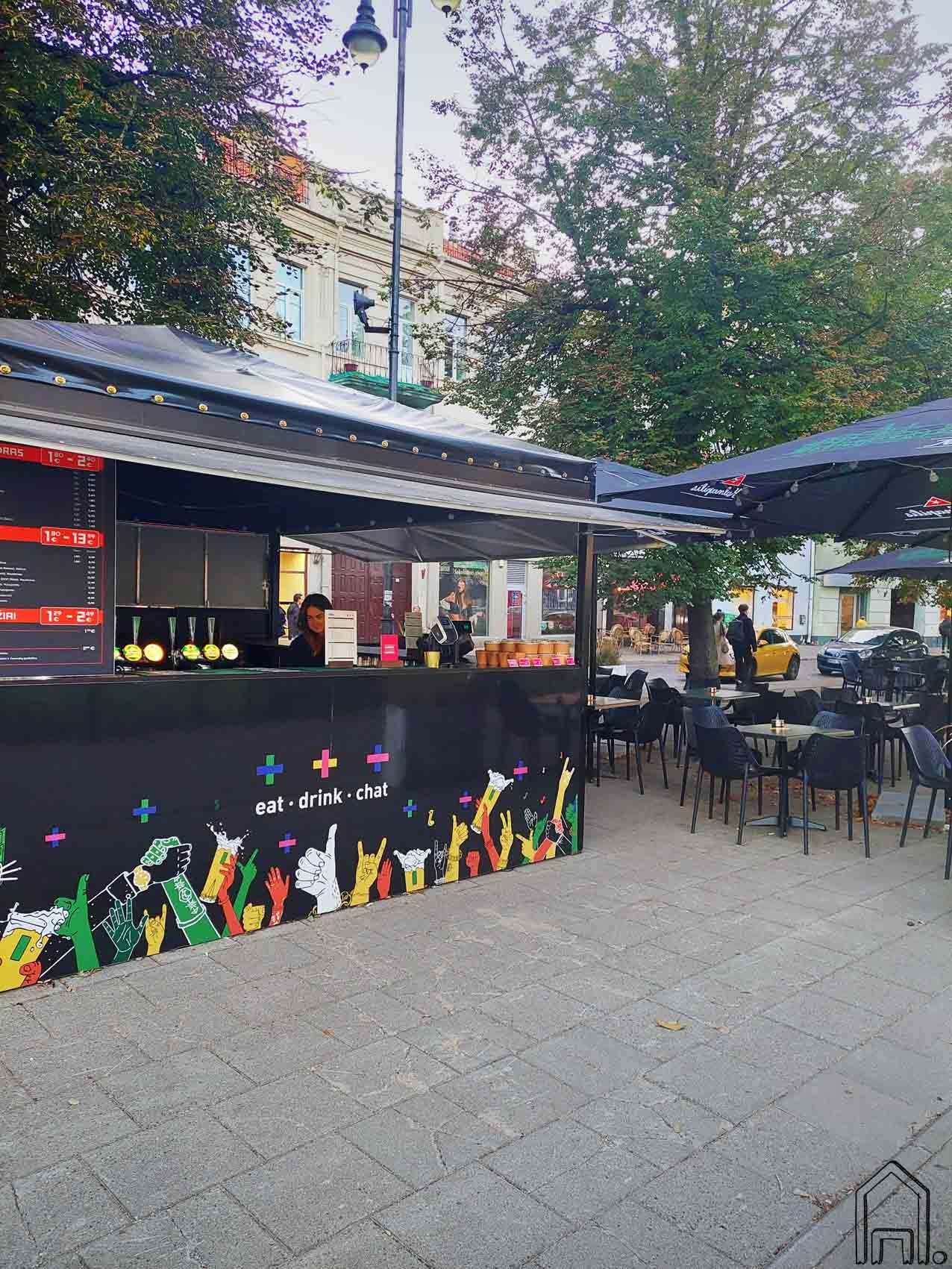 Iliustracijas galima panaudoti pačiais įvairiausiais būdais. Štai "Kalnapiliui" nupieštos nuotaikingos iliustracijos fragmentai papuošė "Plus plus plus" vasaros terasos, įsikūrusios Vilniuje, Vokiečių g. viduryje namelio šonus.