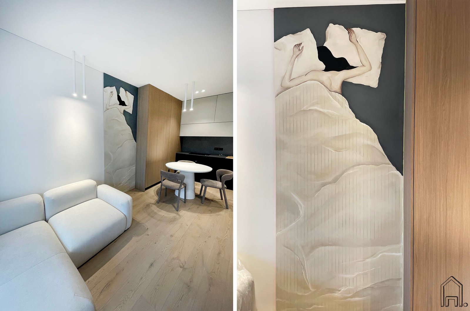 Romantiškas, neutralių pastelinių tonų piešinys, nutapytas svetainėsir valgomojo zonų sandūroje. Šiuolaikiškame interjere įgyvendintas dizainerės idėja - puriuose pataluose paskedęs merginos siluetas.