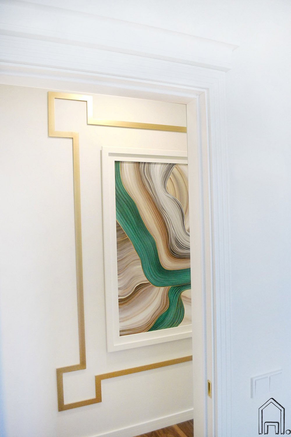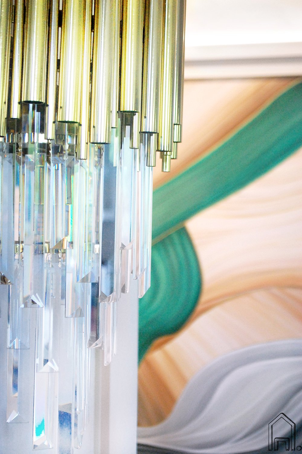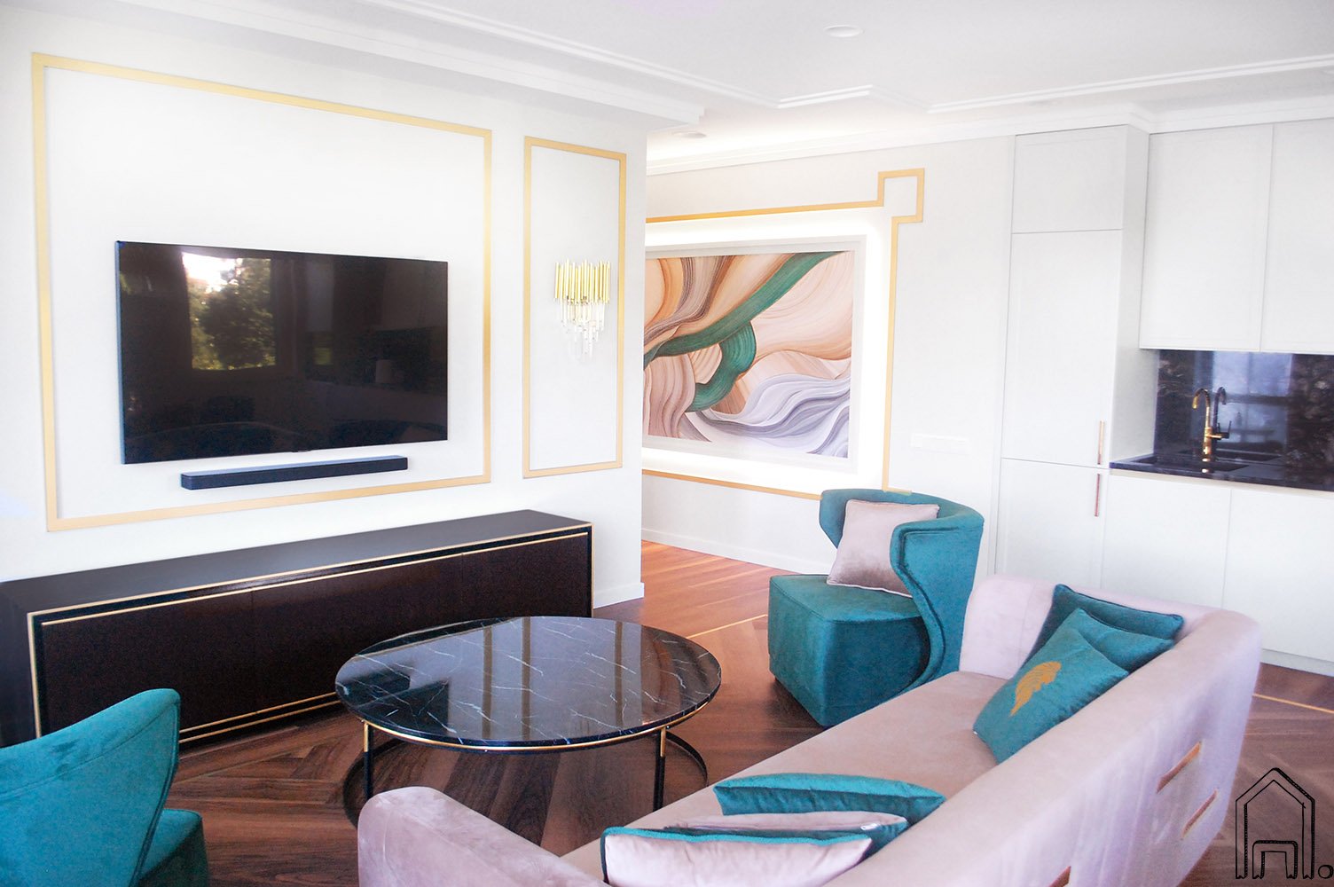 Interjere galima pastebėti ne vieną auksinę detalę: piešiniui suformuotas papildomas dekoratyvus art deco stiliaus aukso rėmelis, svetainės erdvėje ant sienų švelniai žvilga auksiniai moldingai, baldų rankenėlės ir apvadai, tad kai kurios tapytos gijos pabrėžiamos aukso kontūrais.