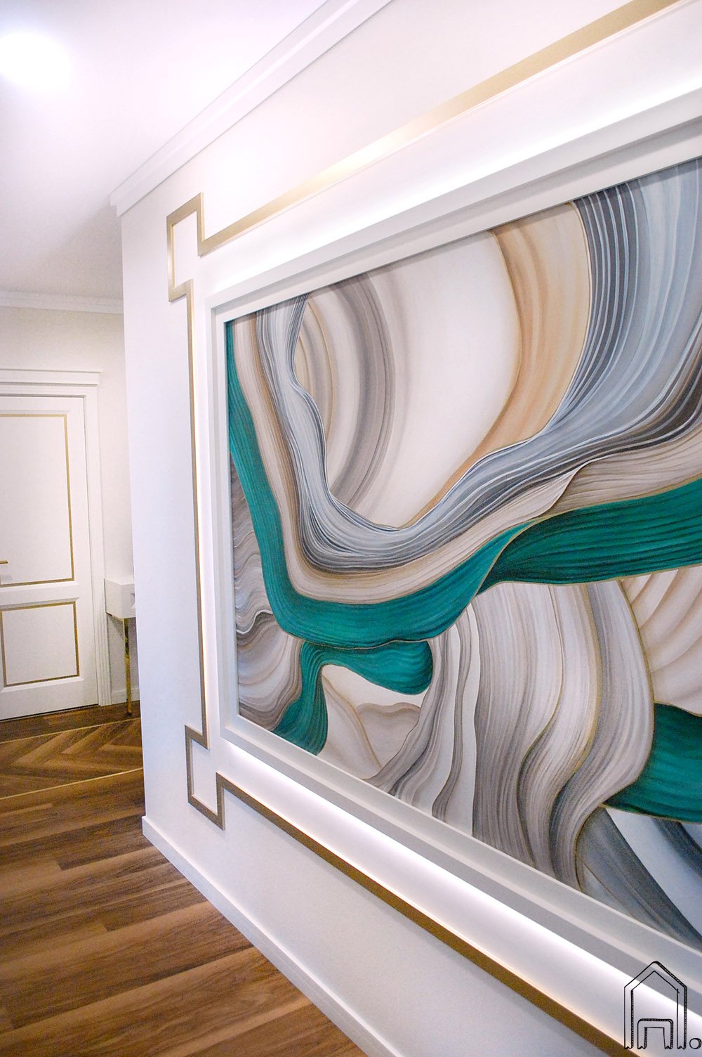Minkštų, banguojančių formų piešinį, lyg paveikslą, įrėmina balti moldingai, tapybos darbo įspūdį sustiprina po moldingu sumontuotas LED apšvietimas.