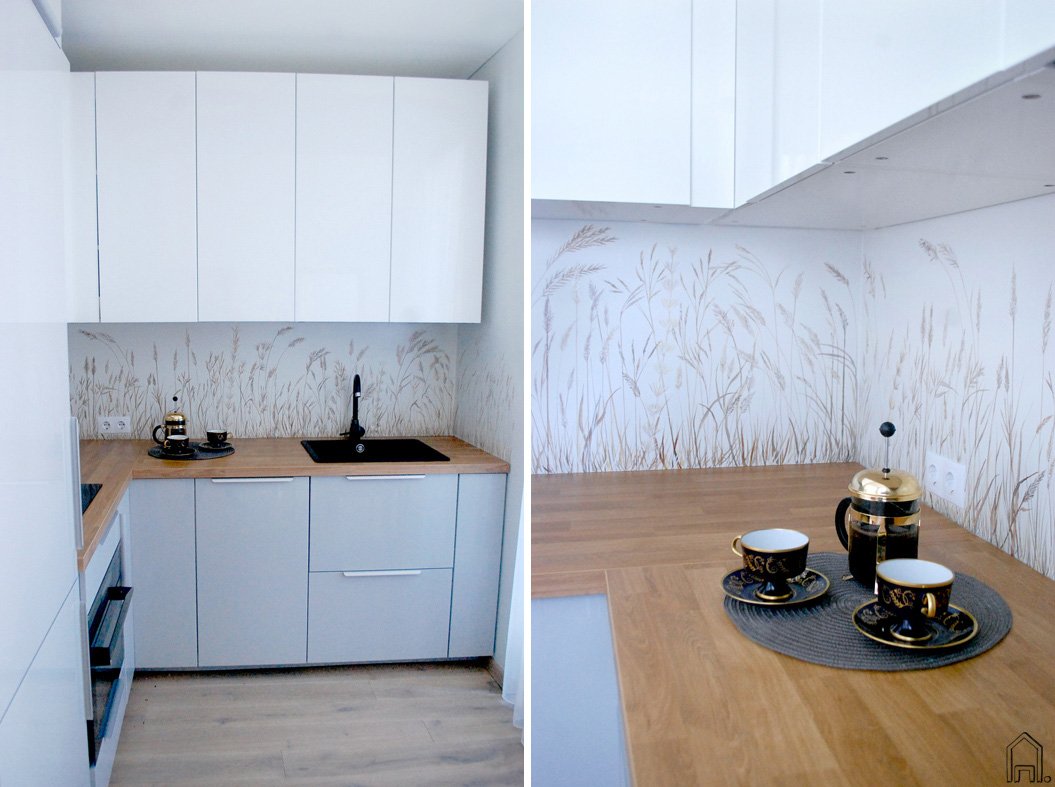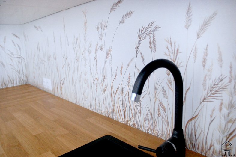 Pajūrio kopose siūbuojančios smilgos drauge su kita būdinga augmenija subtiliai papuošė sienelę, esančią greta virtuvės darbastalio, kurios šeimininkai nenorėjo dengti plytelėmis.