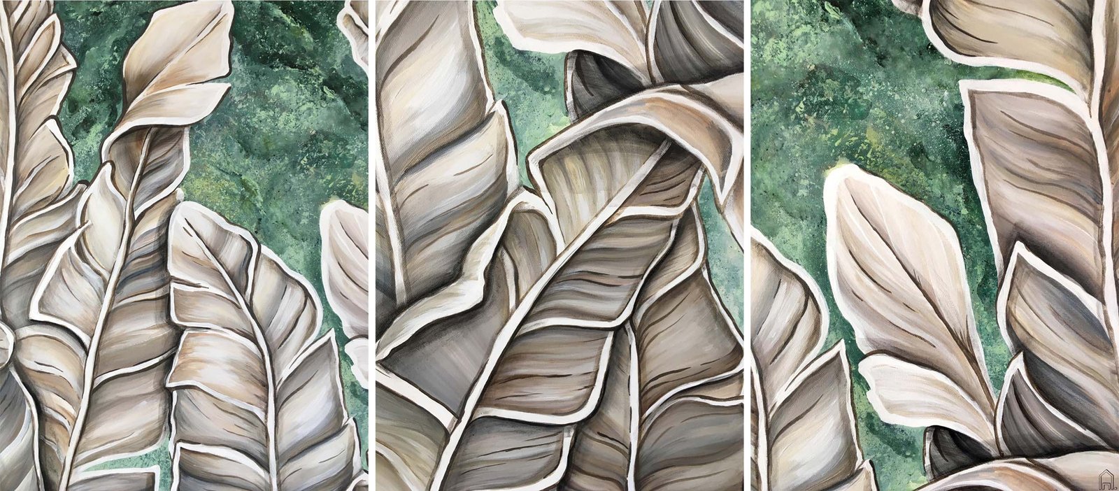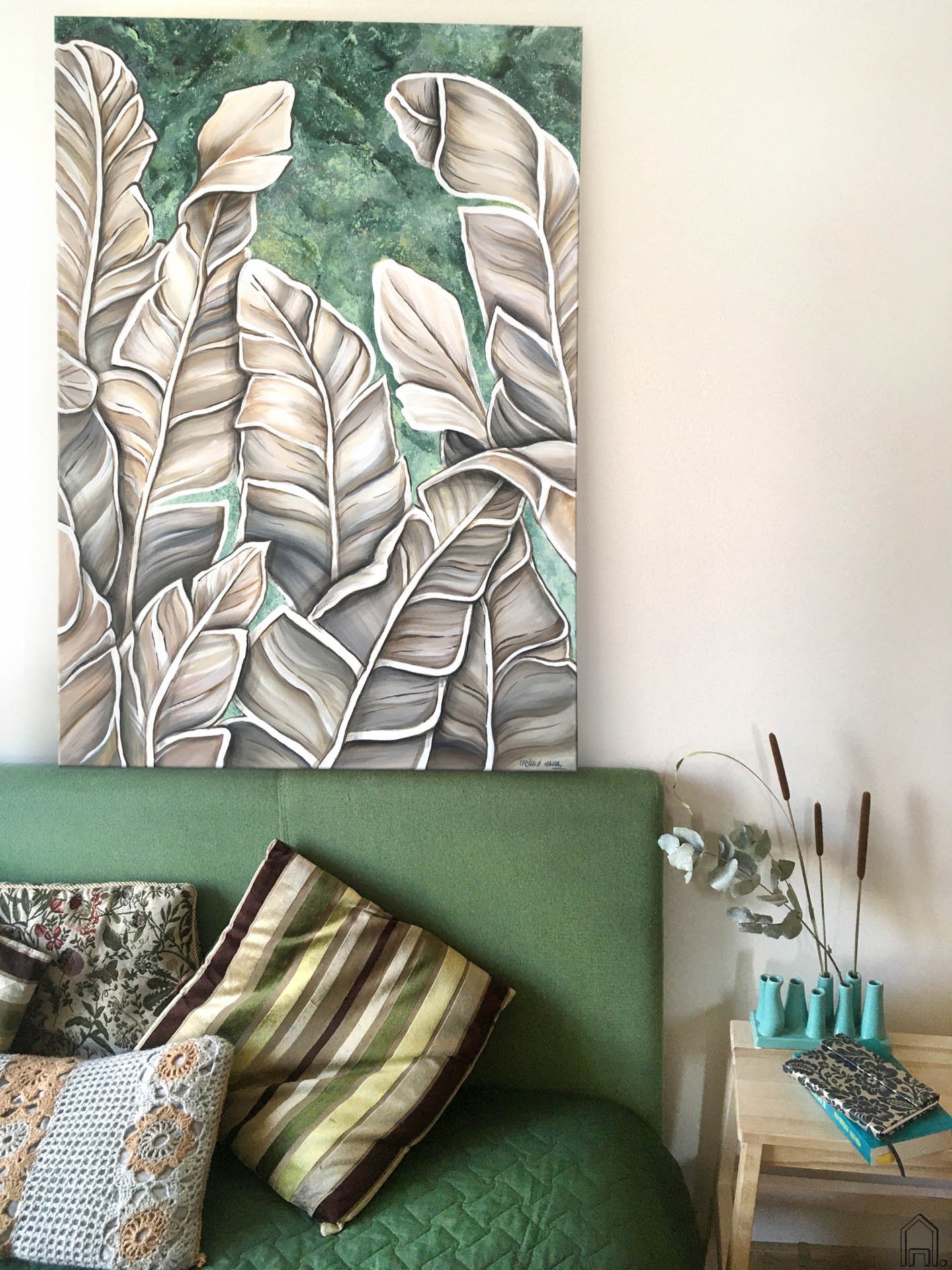 Gamtos motyvų, kaip dekoro, pritaikymas interjere gali būti pats įvairiausias. Šįkart stambūs ir išraiškingi tropinių augalų lapai teptuko pagalba nugulė ant drobės. Tapomai lapijai parinkta mažiau tradicinė šokoladinė spalva derantų prie tokių akcentų, kaip užuolaidos interjere. Ji susimaišo su įvairių rusvų atspalvių palete persidengiančia lapijoje.