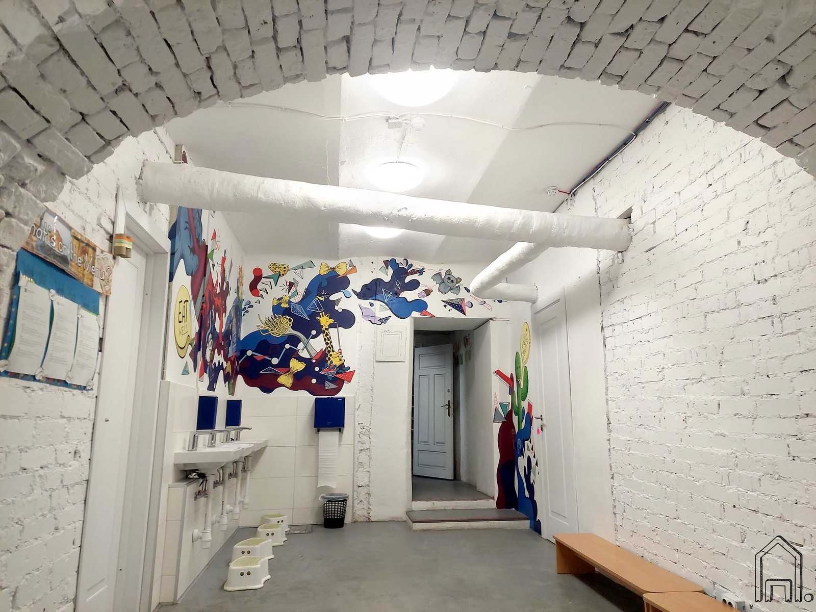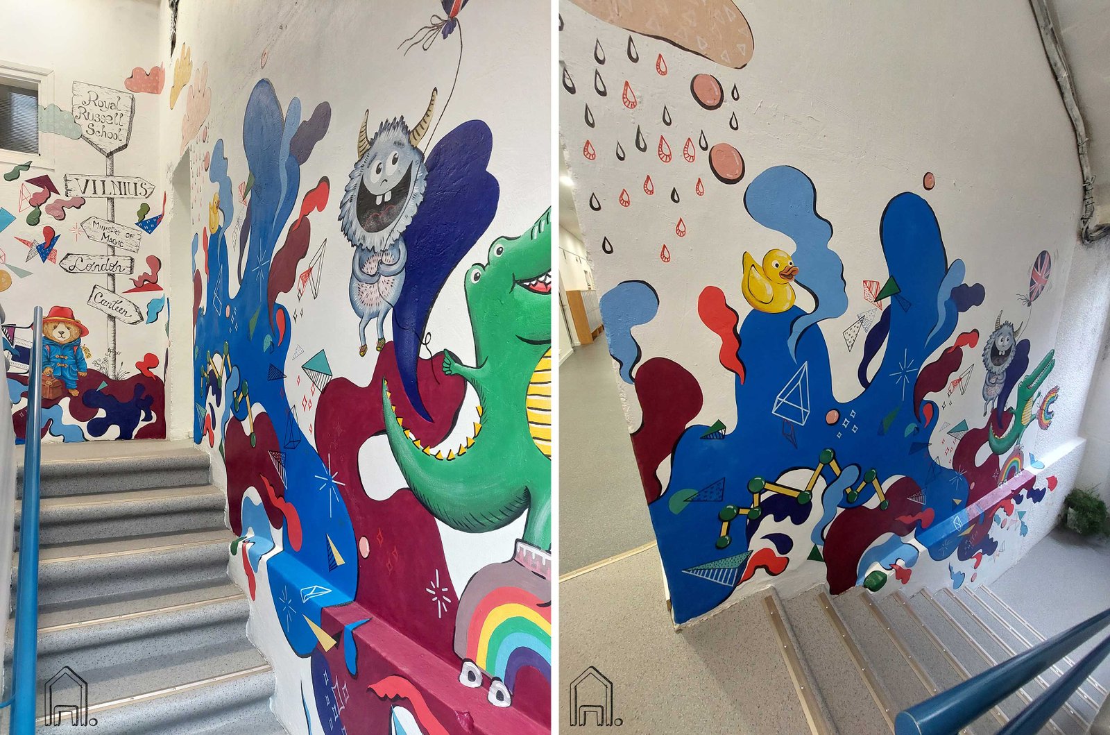 Kylant laiptais aukštyn iš valgyklos į pirmąjį mokyklos aukštą laiptinės sienos užsipildo spalvingais bangų pliūpsniais, kur galima išvysti ir ant bangų besisupantį ančiuką, ir skrendantį raguotą pabaisiuką, ir mokyklos vaikų numilėtinį meškutį Padingtoną.
