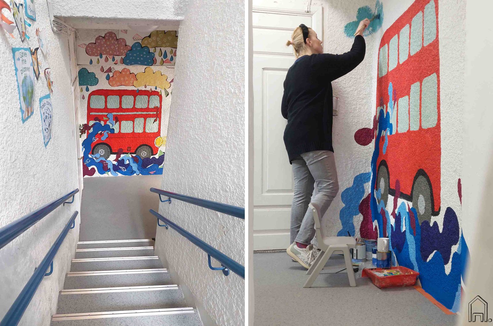 Iš valgyklos prieangio spalvingos dažų bangos nuvingiuoja į koridorių. Čia pavaizduotas ant bangų purslų besisupantis raudonas dviaukštis autobusas - ikoniškas Londono simbolis.