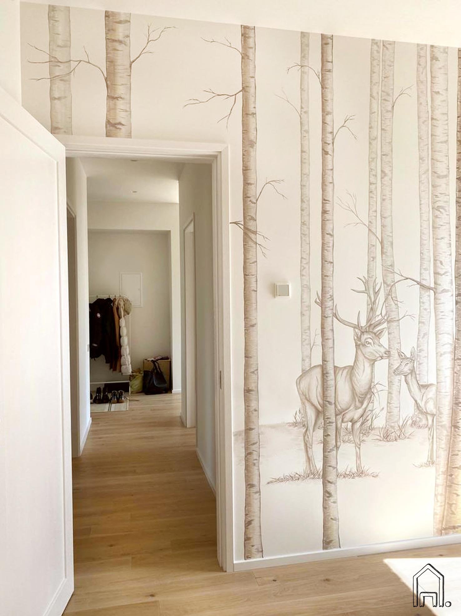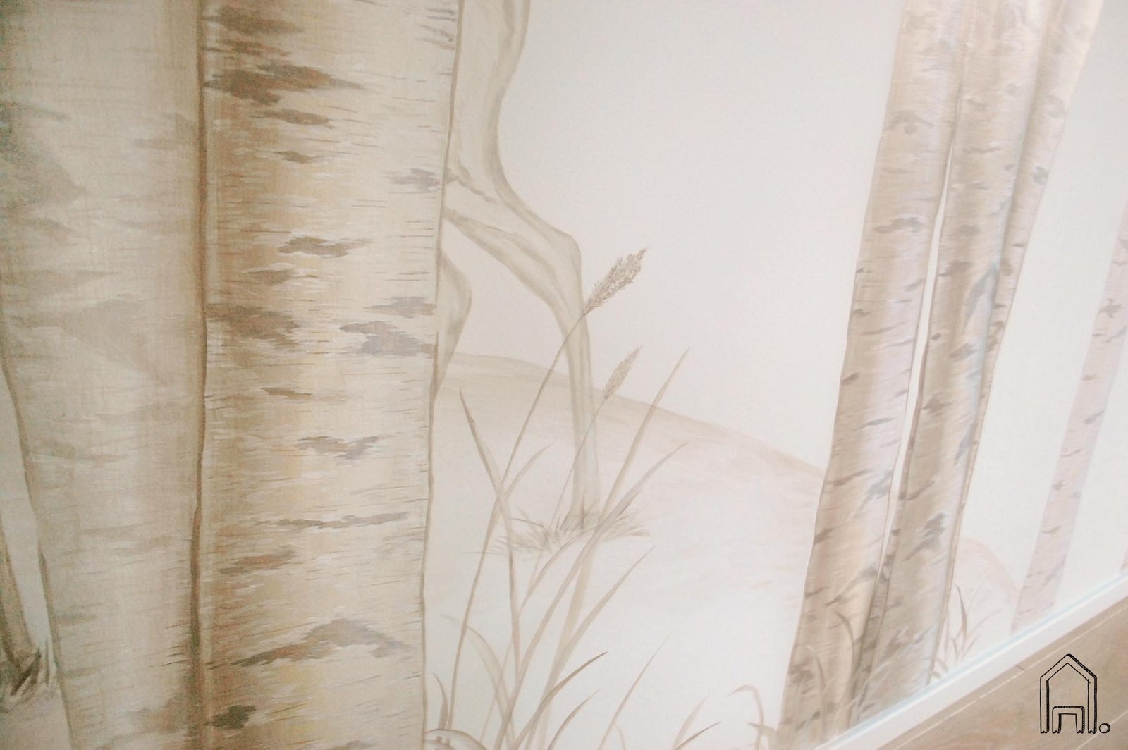Švelnių tonų piešinys, įgyvendintas laukinės gamtos apsuptoje, skandinaviško stiliaus sodyboje. Kadangi pro visus namų langus matomi pasodinti medžiai ar ošiantis miškas, buvo įgyvendinta sodybos šeimininkų idėja miegamojo erdvėje sukurti ramybės oazę, dalelę miško "užauginant" ant miegamojo sienos.