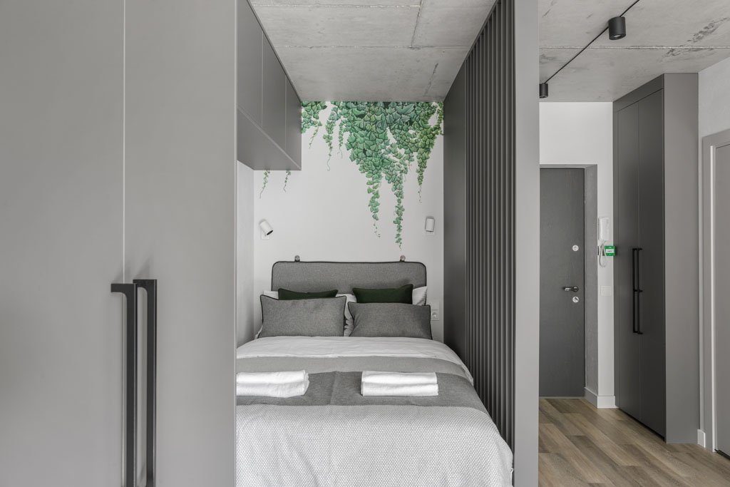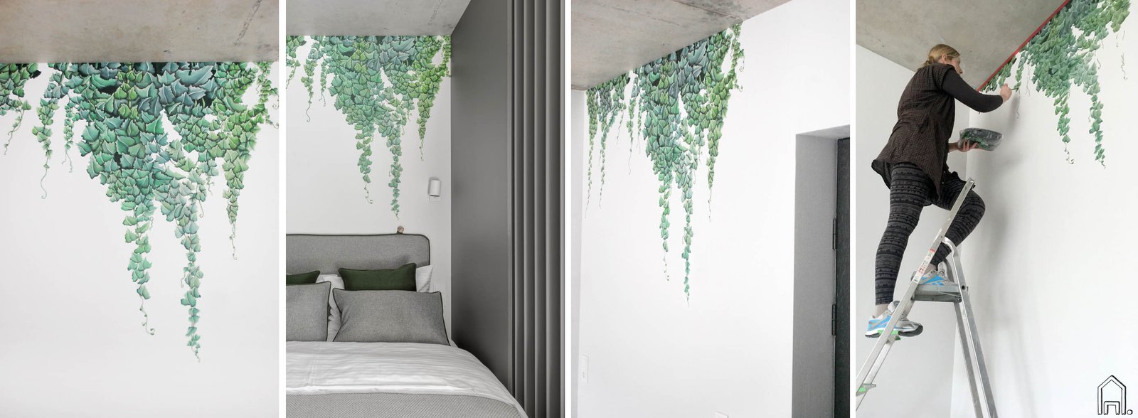Norint erdvei suteikti jaukumo ir šilumos pasirinkta miegamojo zonoje nutapyti nuo lubų žemyn svyrančias gebenes. Žaluma erdvei suteikia gyvybės, subtilus piešinys tampa akcentu minimalistiškoje erdvėje, tuo pačiu išlaikoma urbanistinė interjero estetika.