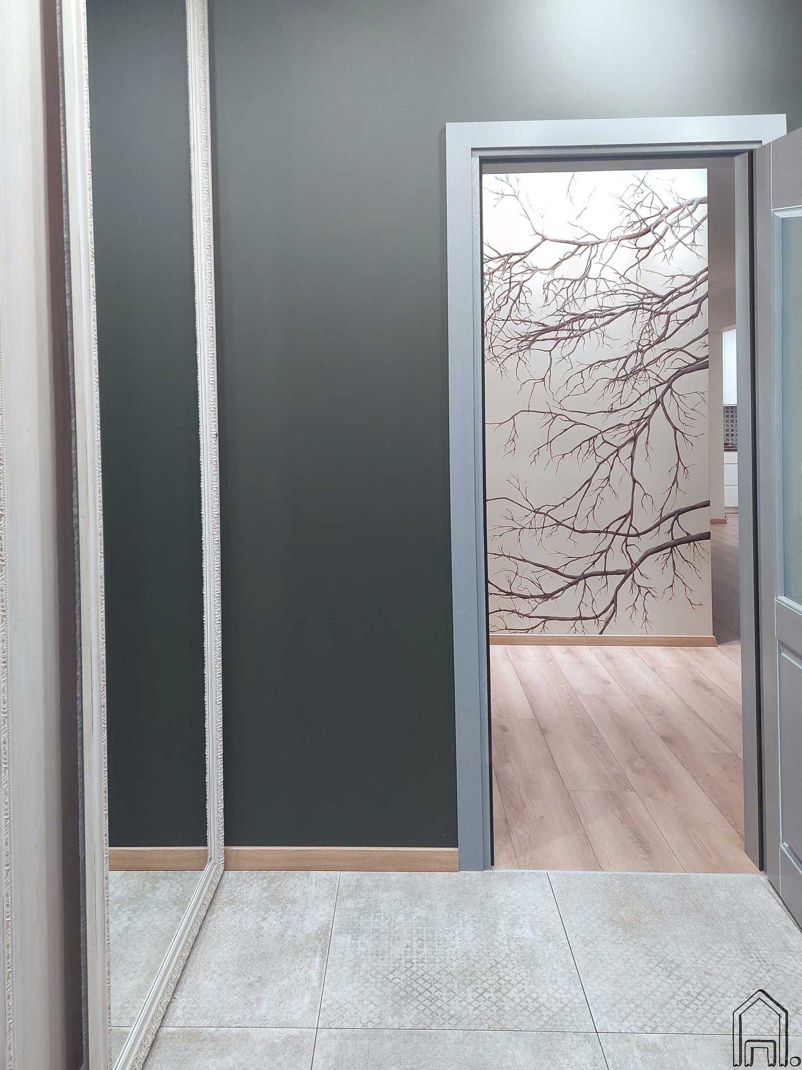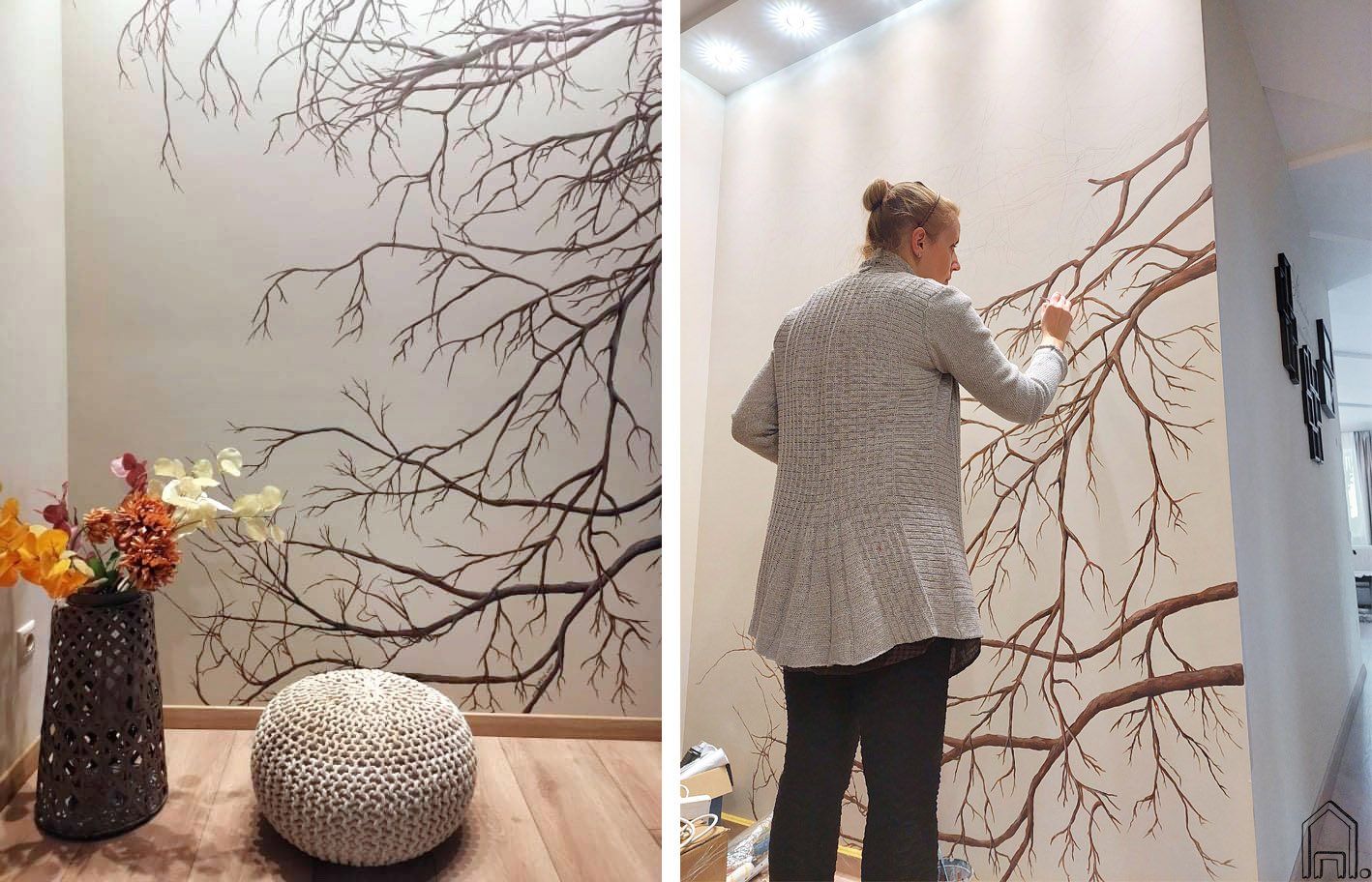 Kai kurios idejos kyla ekspromtu, taip jau tapybos proceso metu su užsakovais nutarėme į piešinį įvesti papildomą pilką toną. Pilka spalva pasirinkta neatsitiktinai: į abi puses nuo piešinio išsišakojančiame koridoriuje sumontuotos pilkos durys vedančios į gyvenamuosius kambarius ir sanitarinius mazgus. Susimaišiau durų spalvai giminingą pilką atspalvį ir ant rudų šakelių nutapiau pilkšvus atspindžius. Taip namų erdvėje atsirado vizualus ryšys tarp piešinio ir erdvėje jau buvusių interjero elementų.