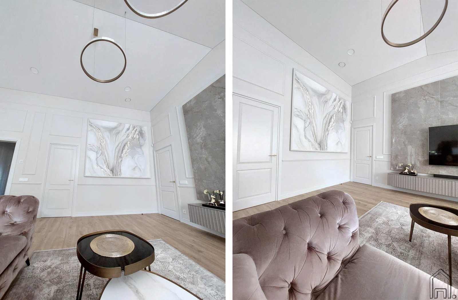 Šviesių, rusvų atspalvių interjere sienos fragmentas suformuotas, kaip speciali erdvė abstrakčiam paveikslui. Paveiksle persipina šviesūs šilti tonai, jame atsiranda visos interjero detalių spalvos: sienų, bagetų, grindų, dekoratyvių akmens plokščių spalvos.