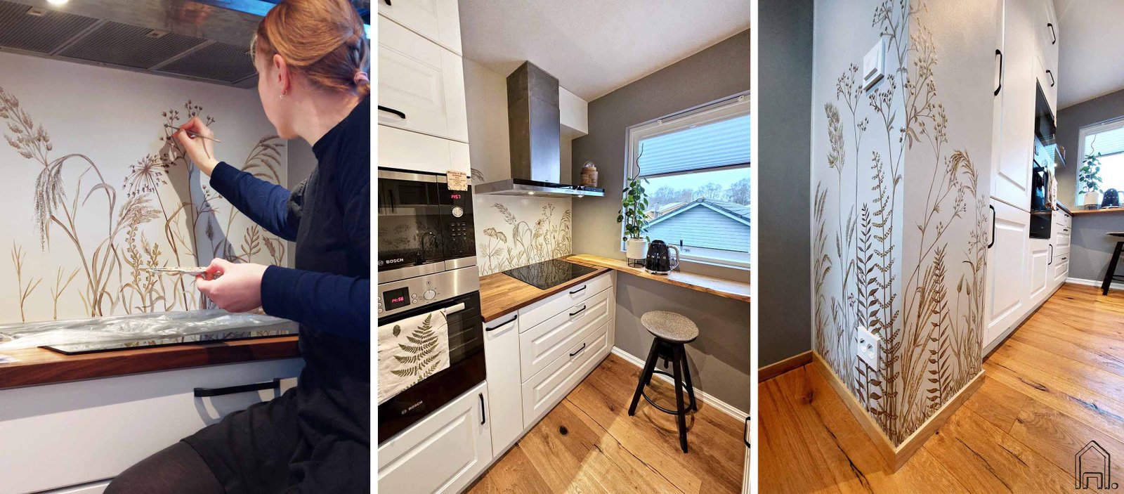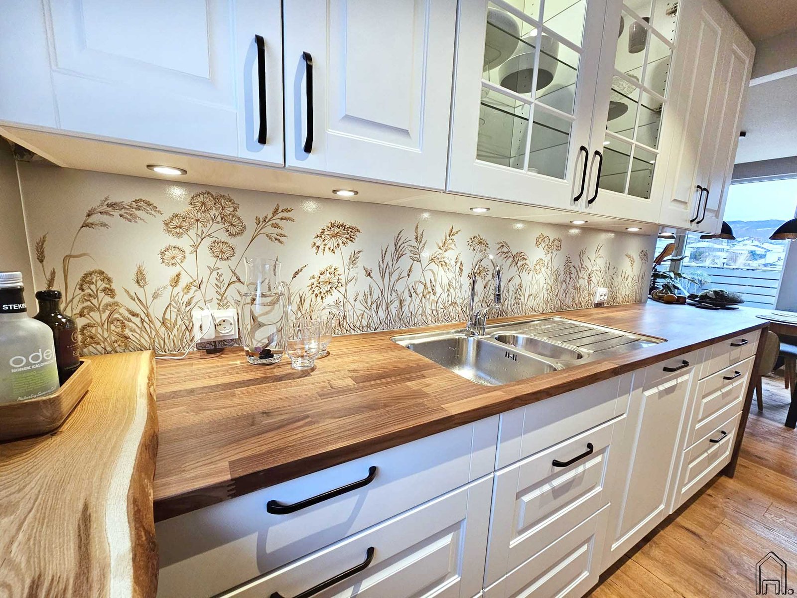 Ši šviesi, pieno baltumo modernios klasikos virtuvės erdvė pagyvinta šiltų atspalvių gamtos motyvų piešiniu. Lyg lengvam vėjeliui pučiant ant virtuvės sienelių švelniai siūbuoja įvairiausi tapyti pievų augalai.